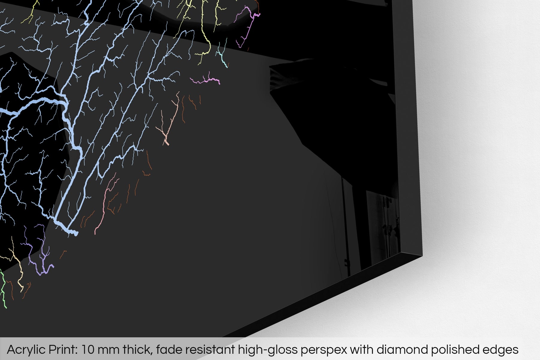 The fine art Giclée print is hand mounted onto a 10mm thick, premium polished, high-gloss acrylic glass that results in a vibrant finish. The transparency of the acrylic enhances the colours and details of the artwork, creating a stunning visual effect that will make a bold statement in any space.