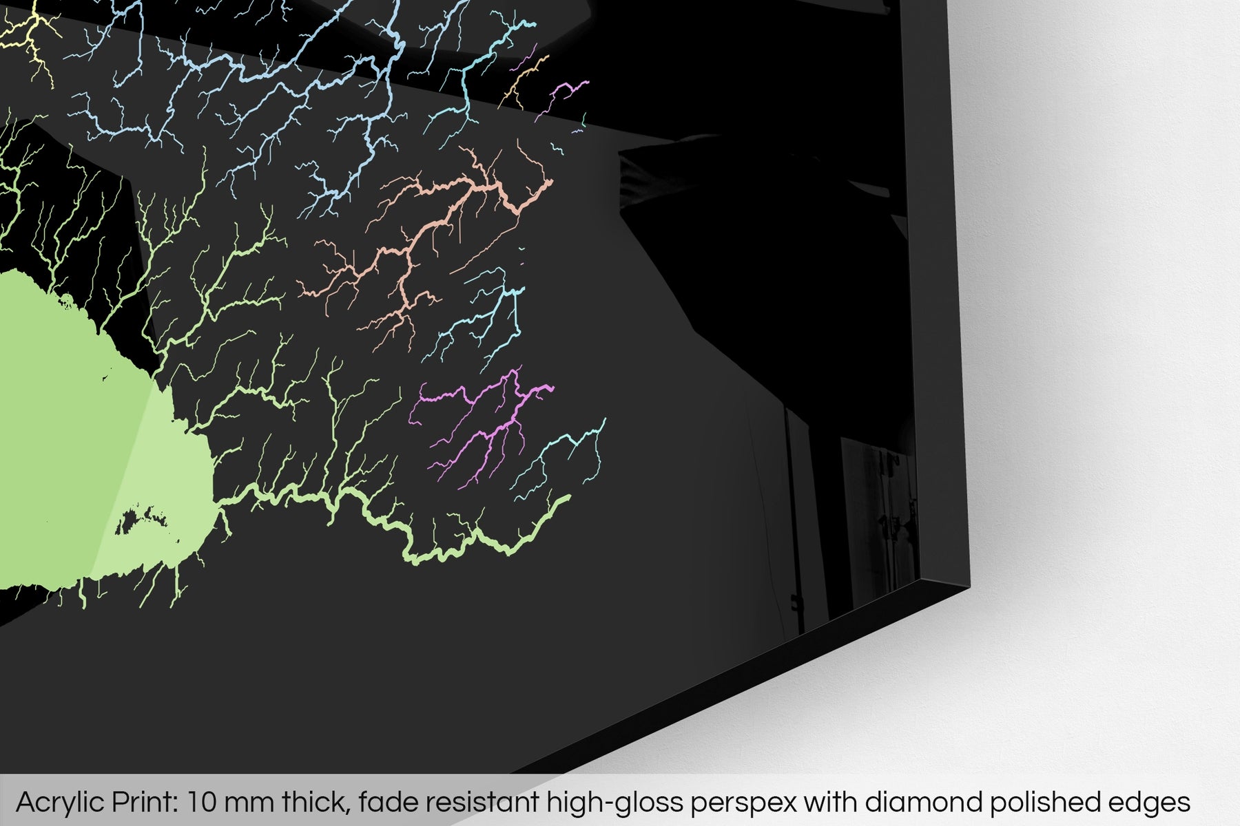 The fine art Giclée print is hand mounted onto a 10mm thick, premium polished, high-gloss acrylic glass that results in a vibrant finish. The transparency of the acrylic enhances the colours and details of the artwork, creating a stunning visual effect that will make a bold statement in any space.