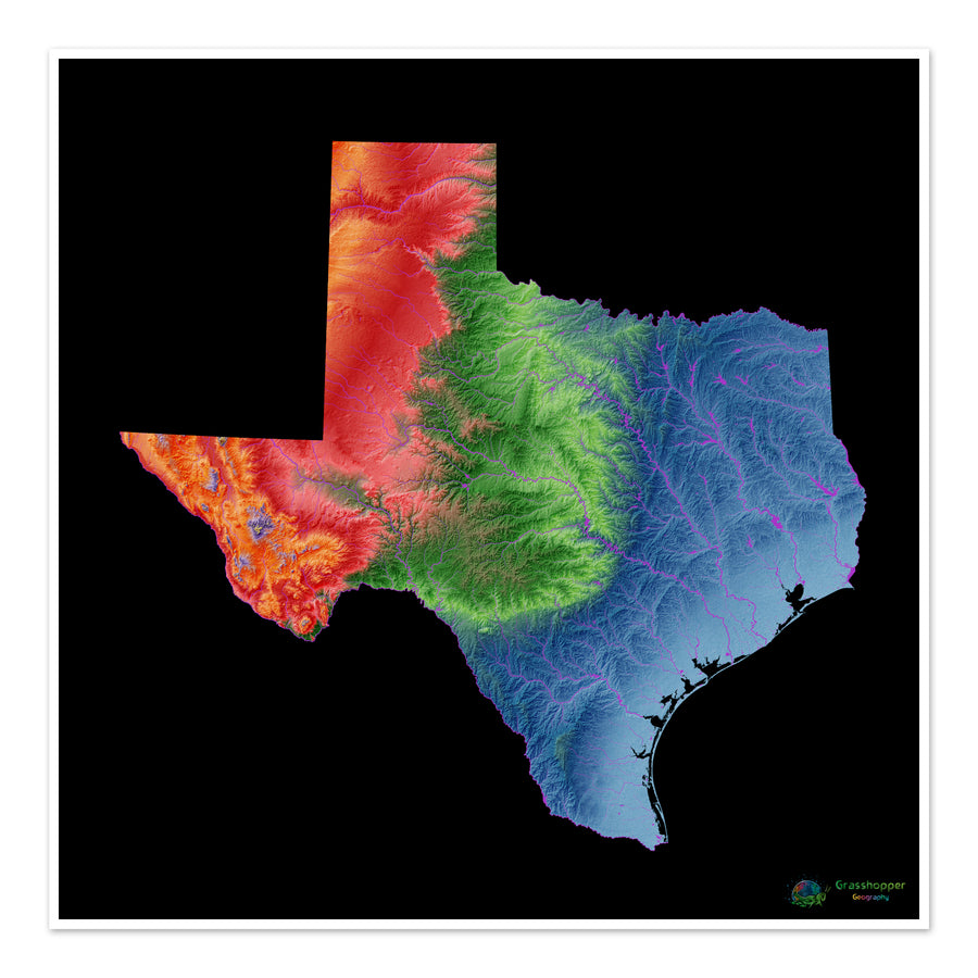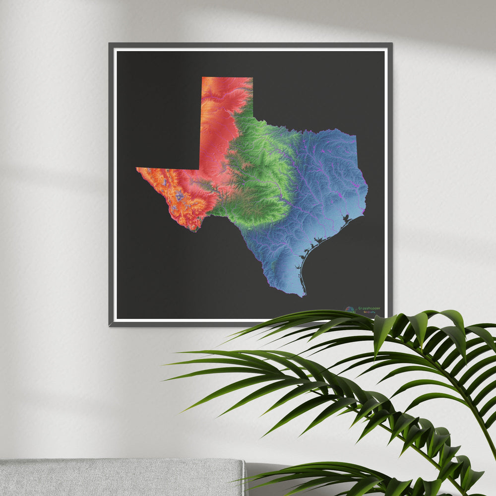 黒い背景のテキサス州の標高地図のファインアートプリント。衛星データから生成されたデジタル標高モデルに基づいた、ユニークな配色の高解像度標高地図。
