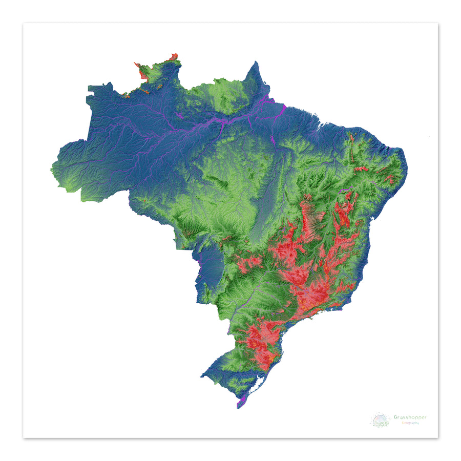 Elevation map of Brazil with white background Fine Art Print. High resolution elevation map in a unique colour scheme, based on digital elevation models generated from satellite data.