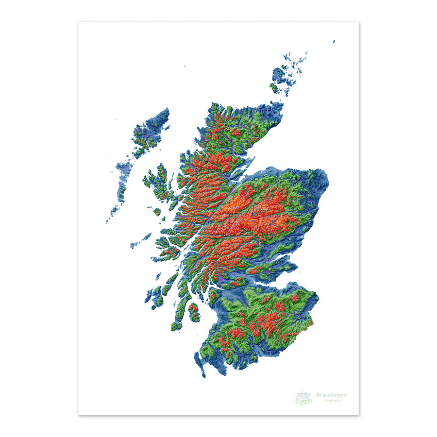 Elevation map of Scotland with white background Fine Art Print. High resolution elevation map in a unique colour scheme, based on digital elevation models generated from satellite data.