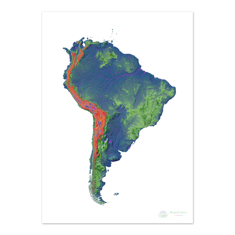 Elevation map of South America with white background Fine Art Print. High resolution elevation map in a unique colour scheme, based on digital elevation models generated from satellite data.