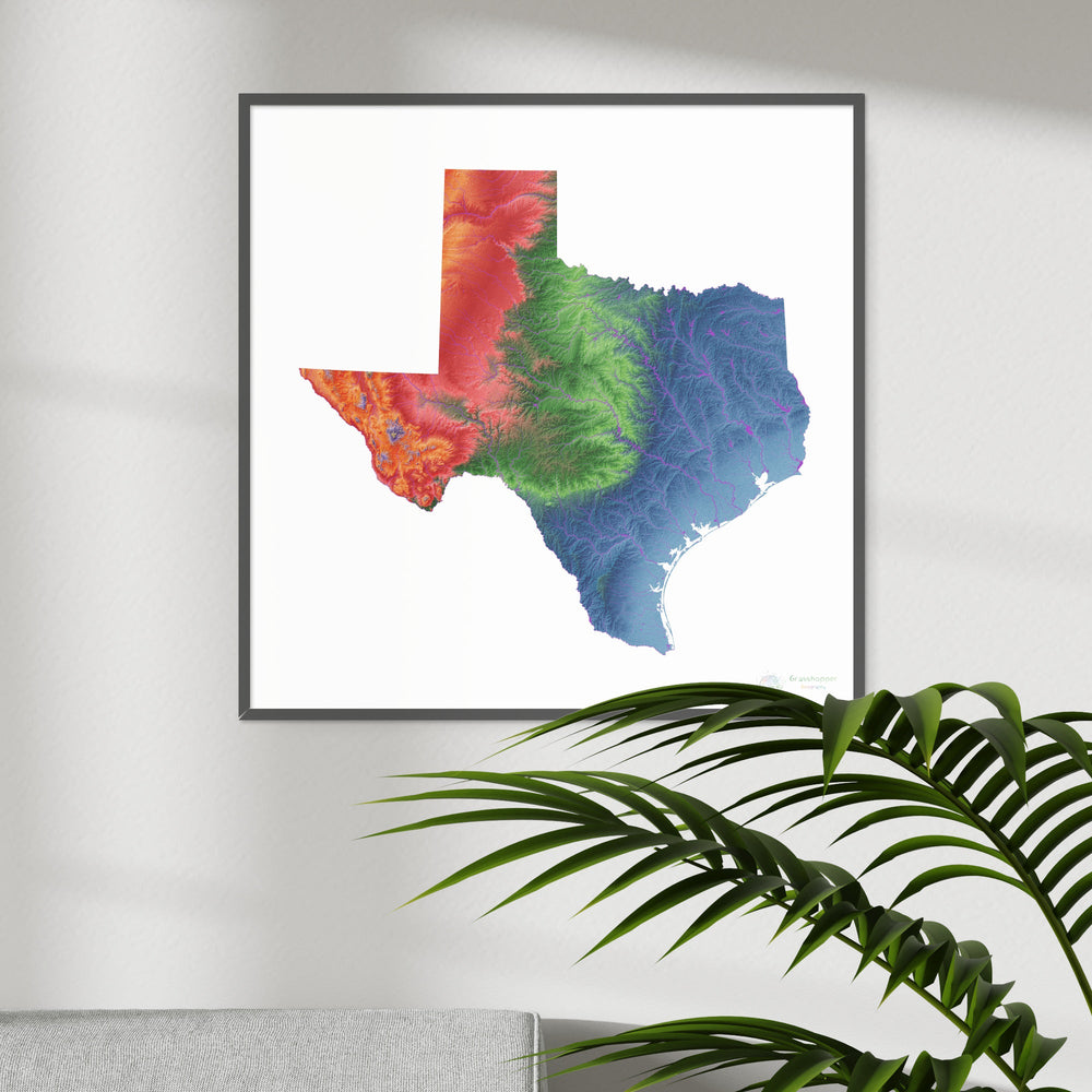 Elevation map of Texas with white background Fine Art Print. High resolution elevation map in a unique colour scheme, based on digital elevation models generated from satellite data.