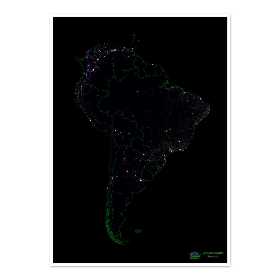 Population density heatmap of South America Fine Art Print. High resolution population density map based on detailed global datasets, made to resemble star constellations and nebulae. The darker colours represent really low density areas, the yellows are dense urban centres and the purples in between.