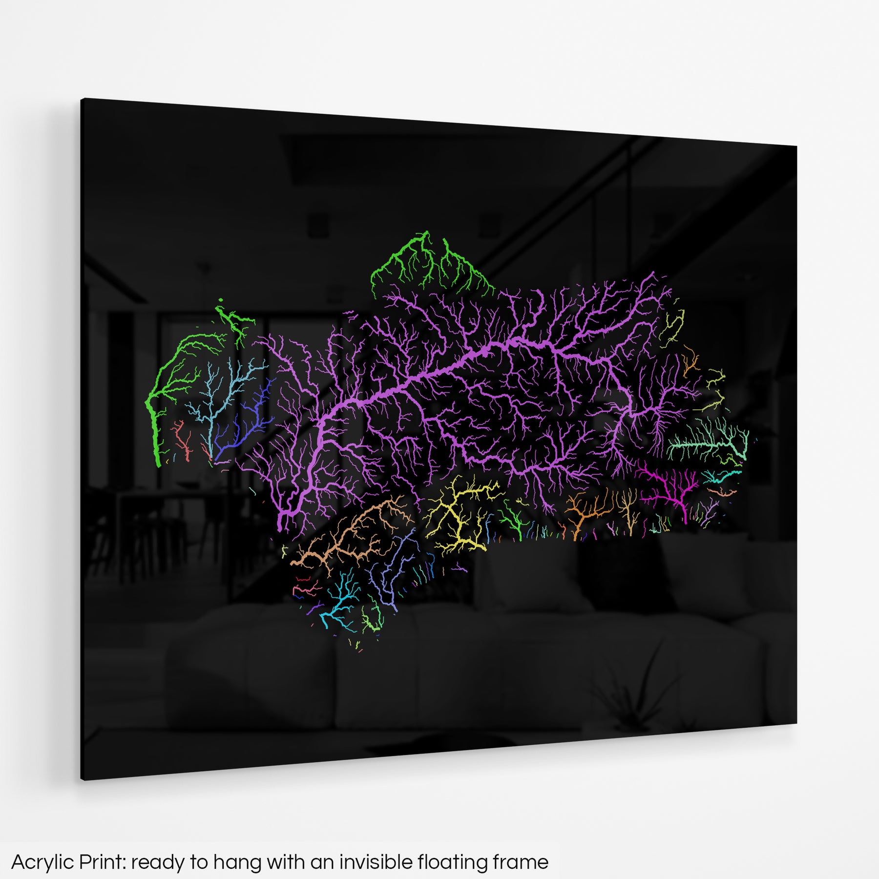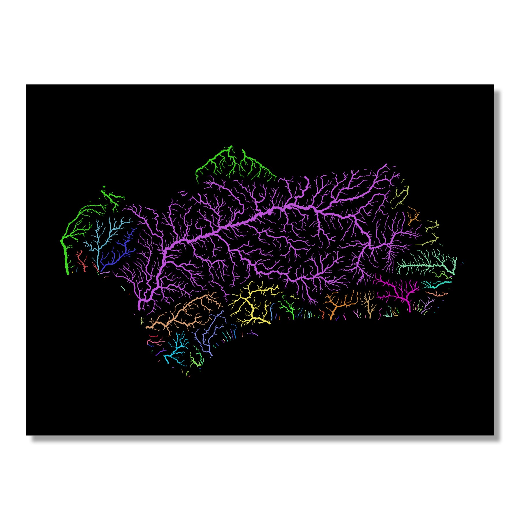 This high-resolution river basin map shows each catchment area in a different colour. Its vibrant colour scheme makes this map a lively addition to any space.