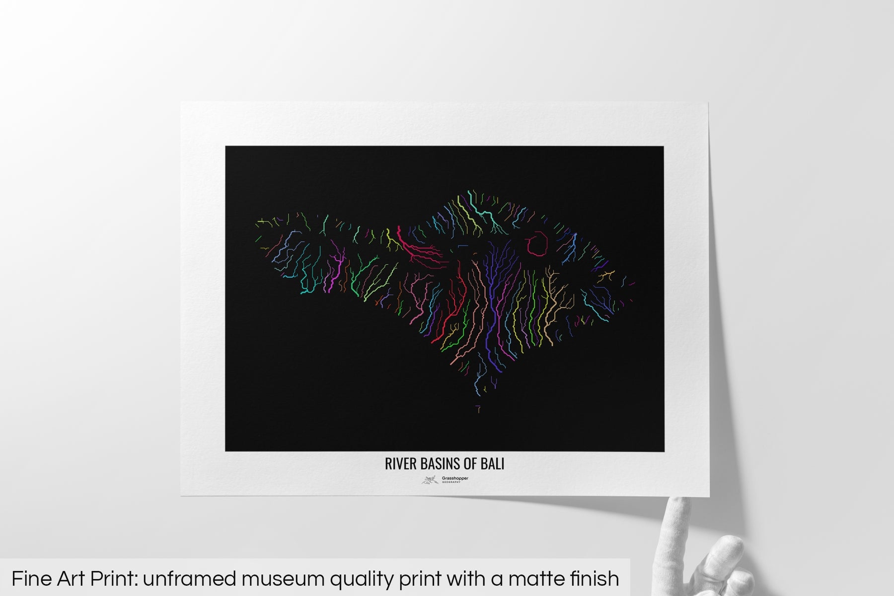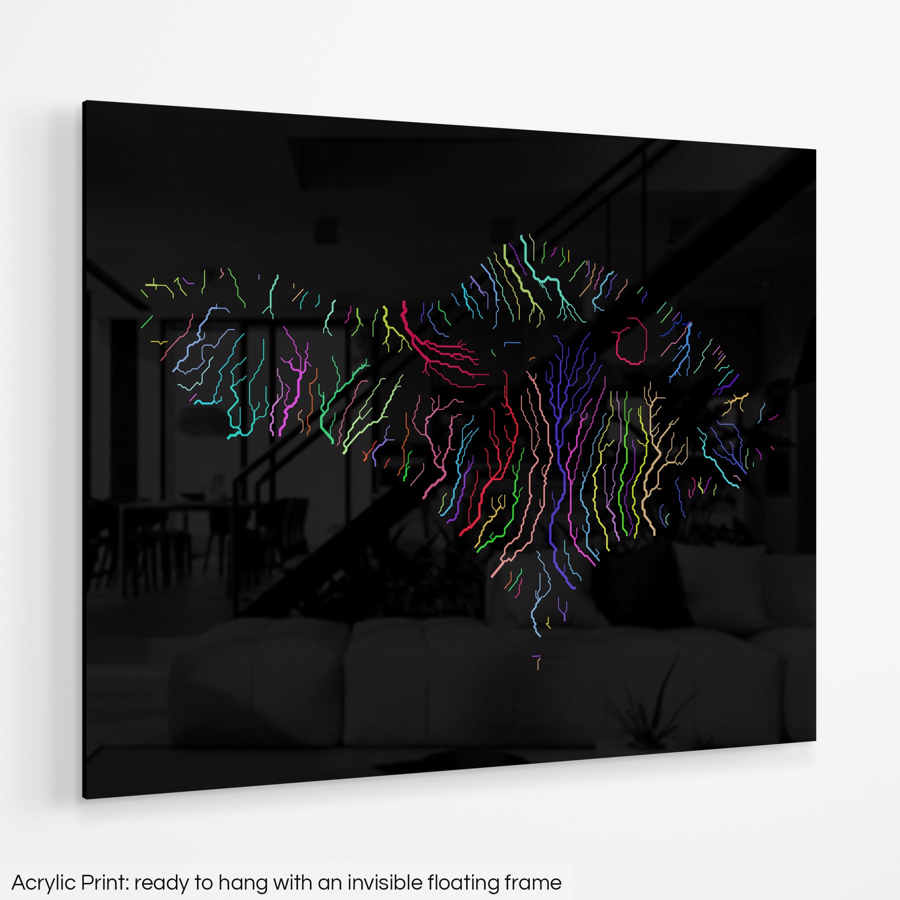 This high-resolution river basin map shows each catchment area in a different colour. Its vibrant colour scheme makes this map a lively addition to any space.