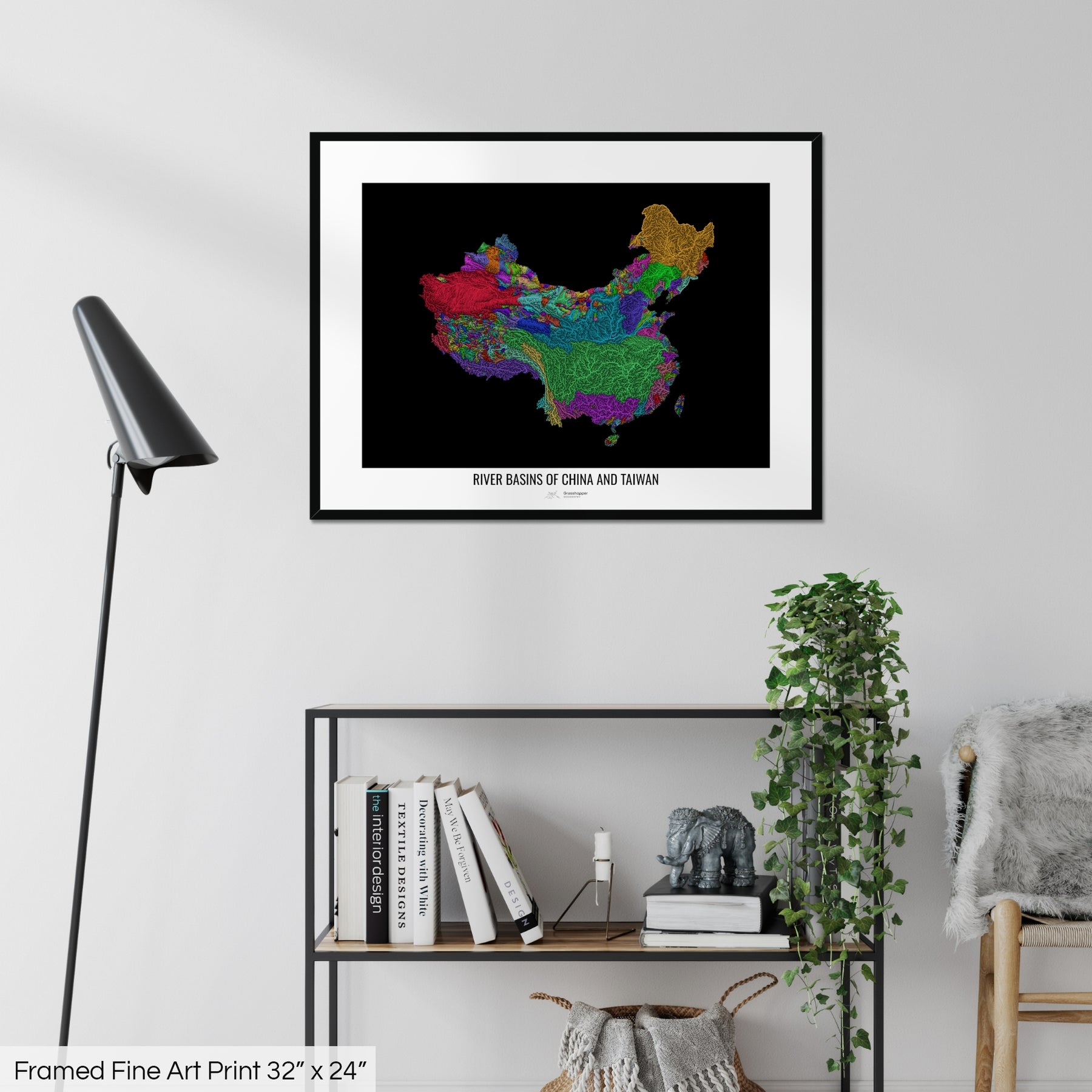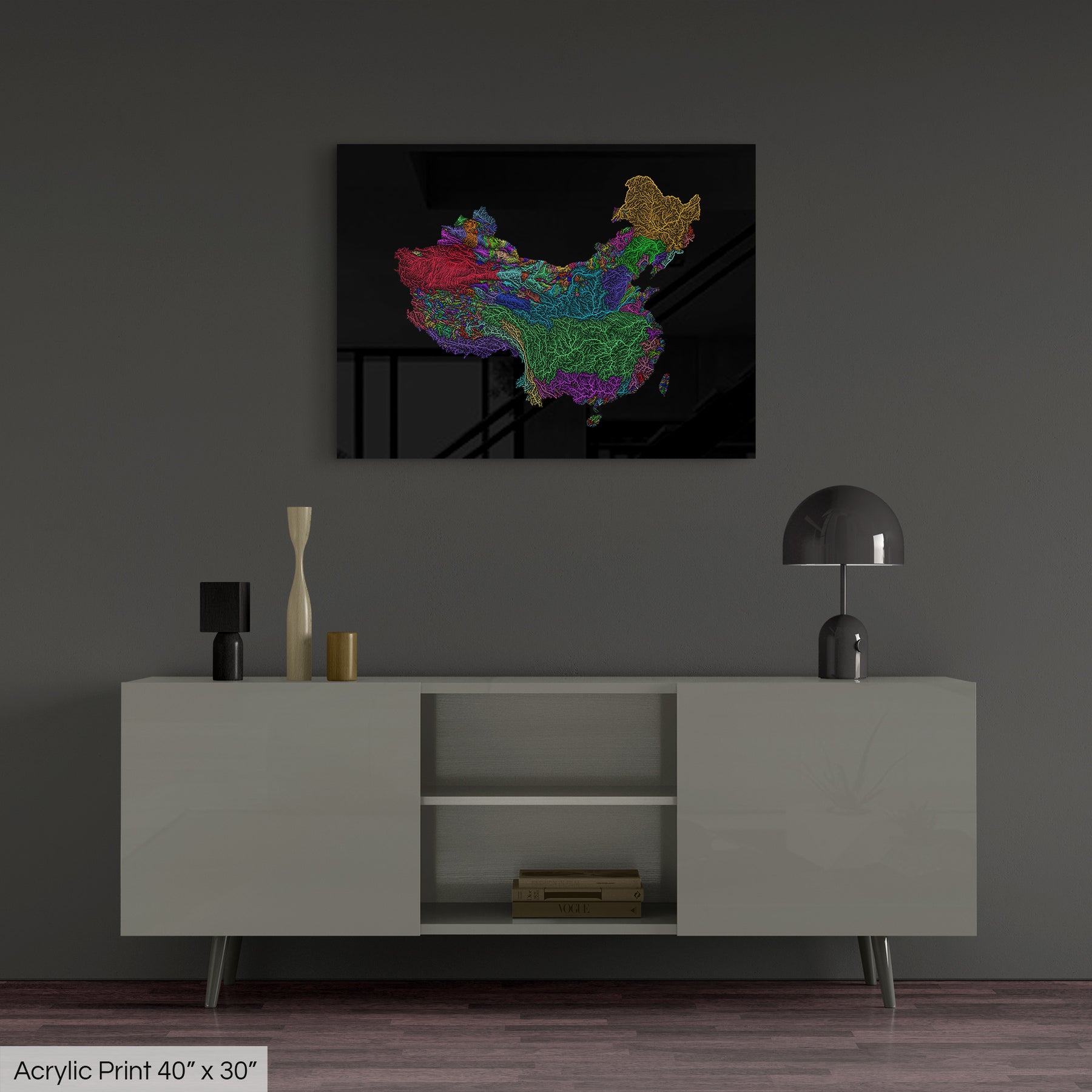 China and Taiwan - River basin map, rainbow colours - Wall Art
