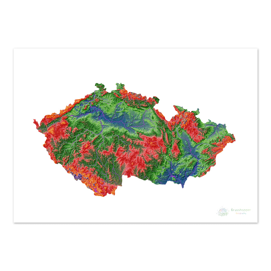 Mapa de elevação da República Tcheca com impressão Fine Art de fundo branco. Mapa de elevação de alta resolução em um esquema de cores exclusivo, baseado em modelos de elevação digitais gerados a partir de dados de satélite.