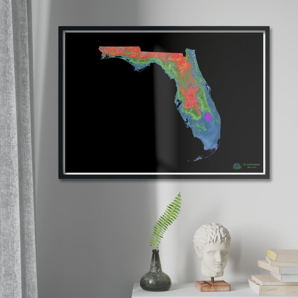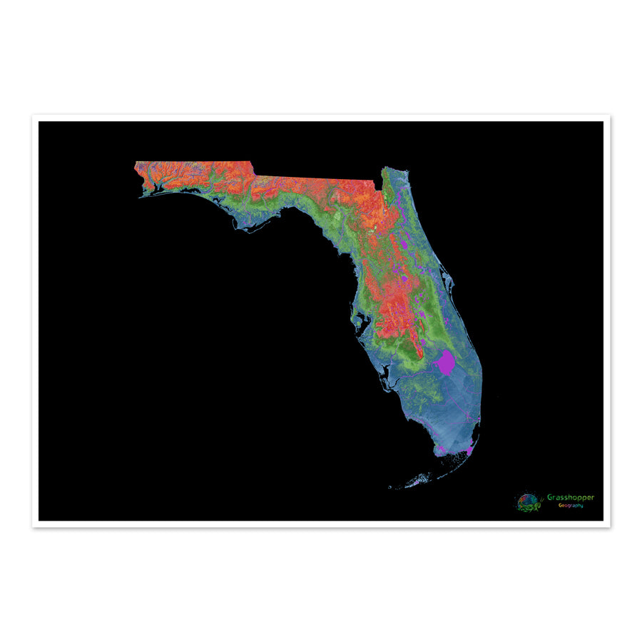 Mapa de elevação da Flórida com fundo preto Fine Art Print. Mapa de elevação de alta resolução em um esquema de cores exclusivo, baseado em modelos de elevação digitais gerados a partir de dados de satélite.