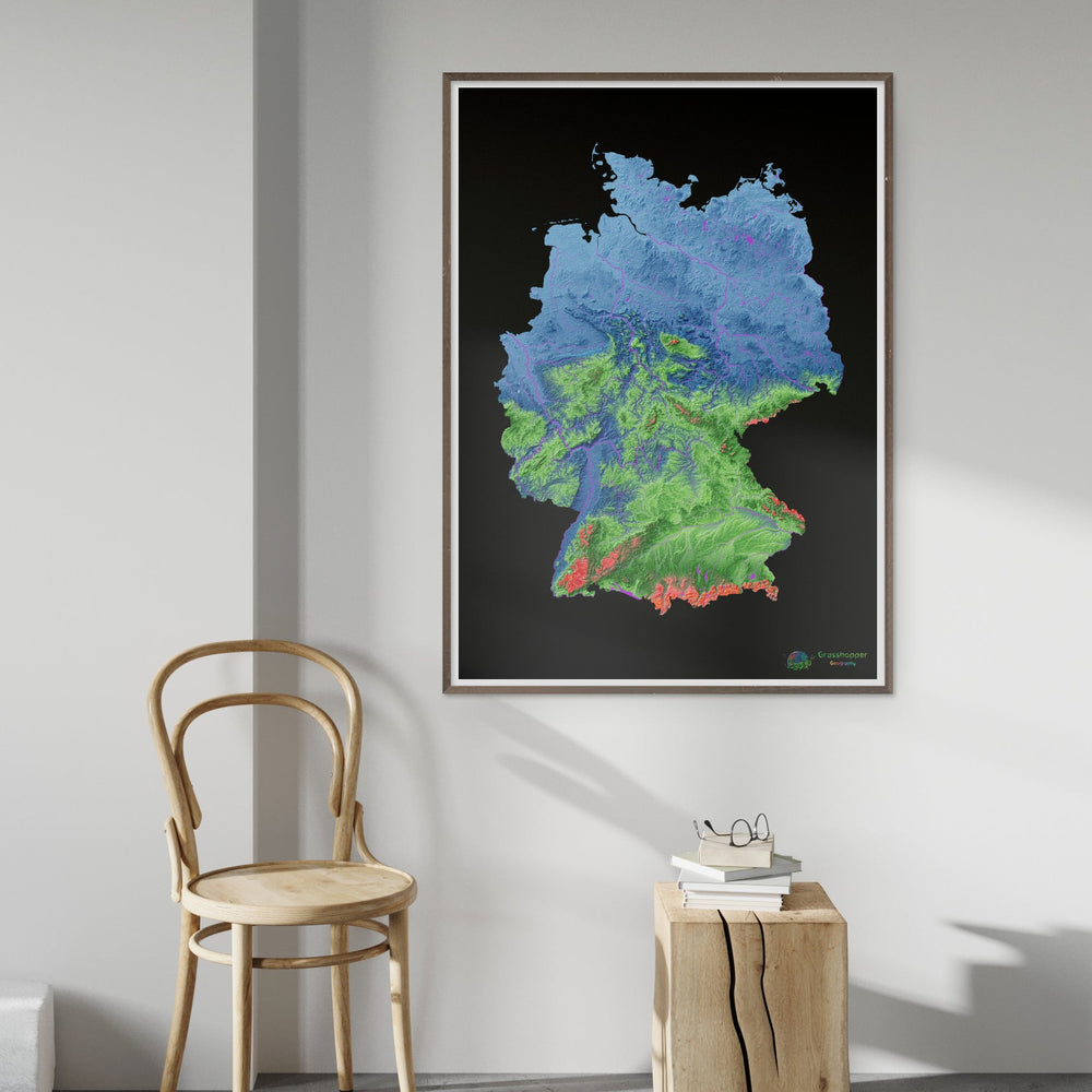 Mapa de elevação da Alemanha com fundo preto Fine Art Print. Mapa de elevação de alta resolução em um esquema de cores exclusivo, baseado em modelos de elevação digitais gerados a partir de dados de satélite.