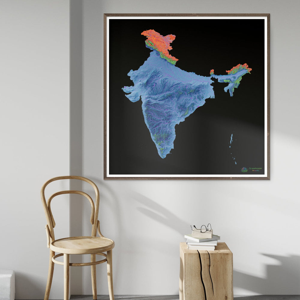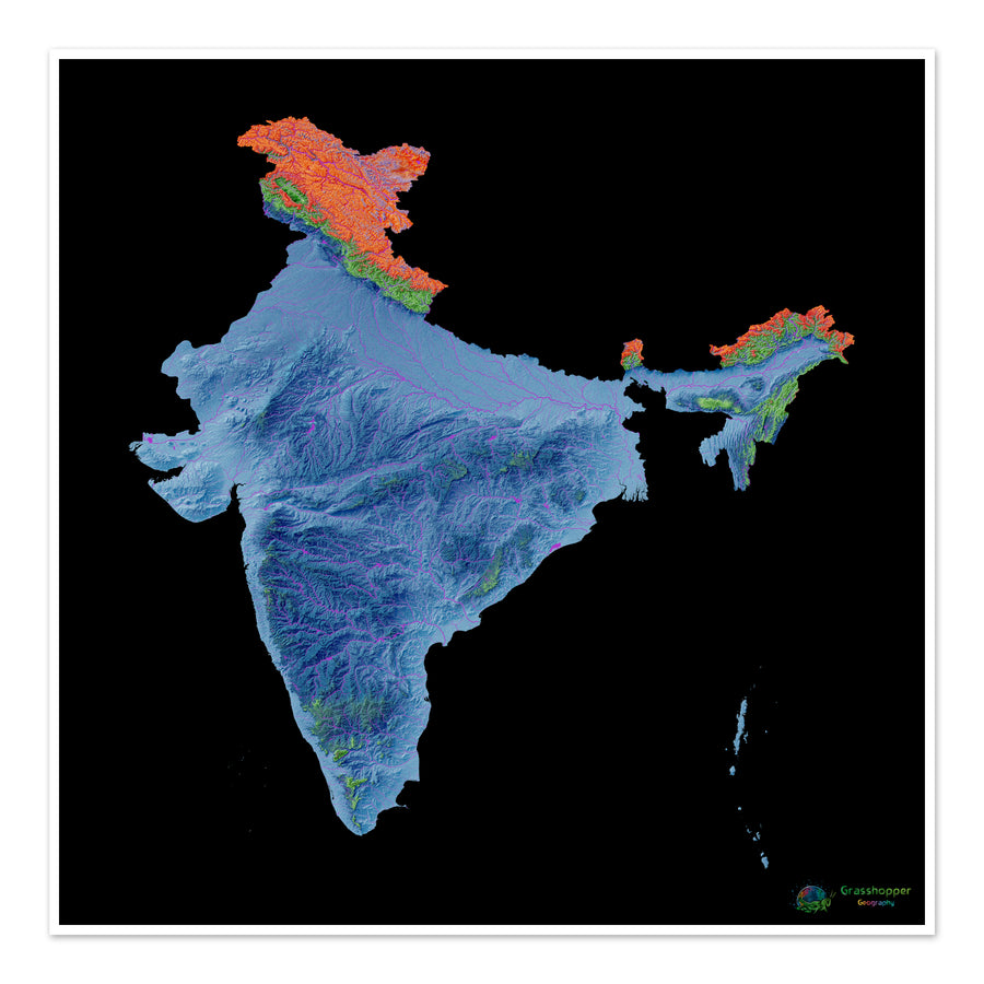 Mapa de elevação da Índia com fundo preto Fine Art Print. Mapa de elevação de alta resolução em um esquema de cores exclusivo, baseado em modelos de elevação digitais gerados a partir de dados de satélite.