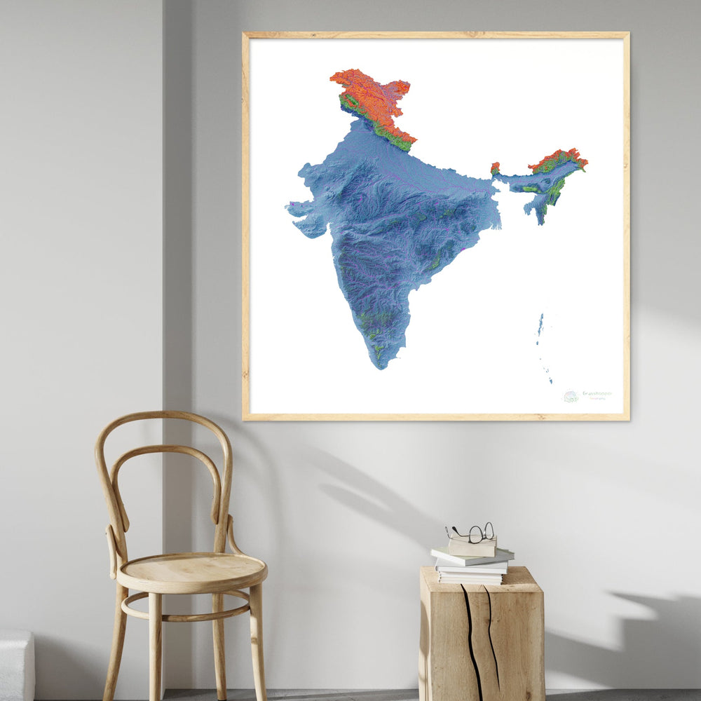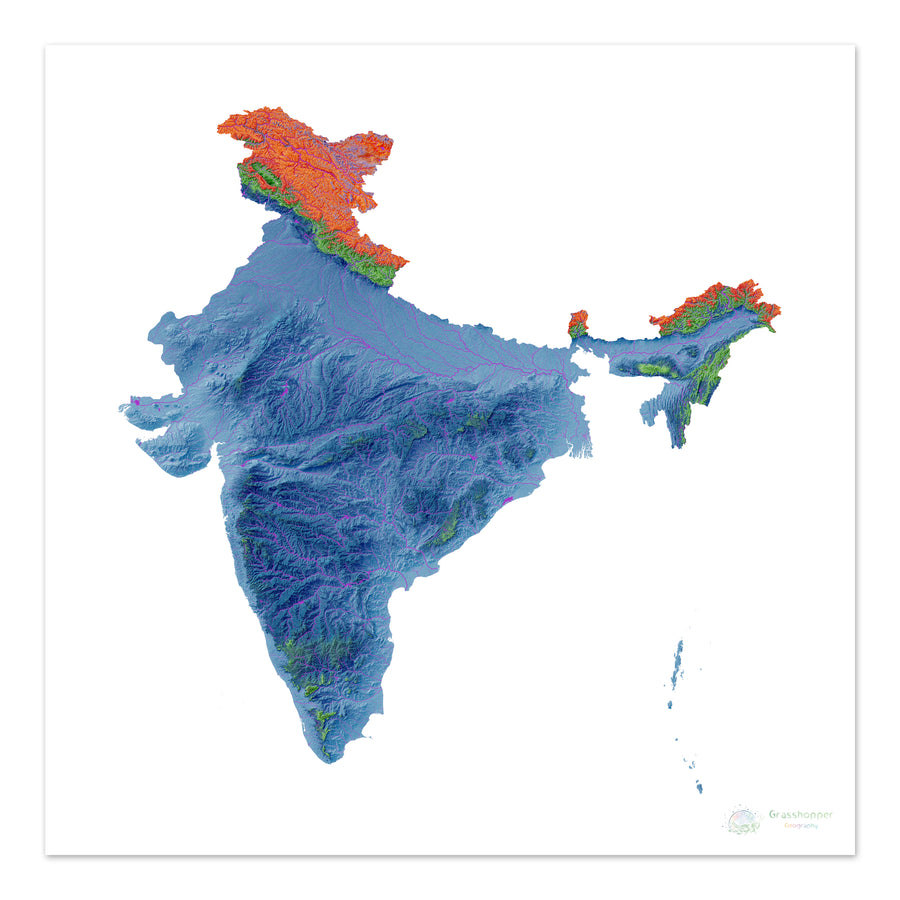 Mapa de elevação da Índia com fundo branco Fine Art Print. Mapa de elevação de alta resolução em um esquema de cores exclusivo, baseado em modelos de elevação digitais gerados a partir de dados de satélite.