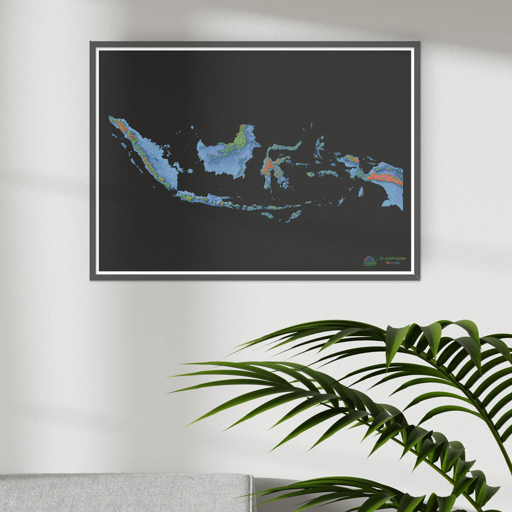 Mapa de elevação da Indonésia com fundo preto Fine Art Print. Mapa de elevação de alta resolução em um esquema de cores exclusivo, baseado em modelos de elevação digitais gerados a partir de dados de satélite.