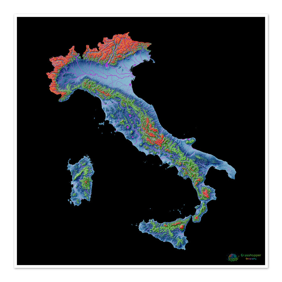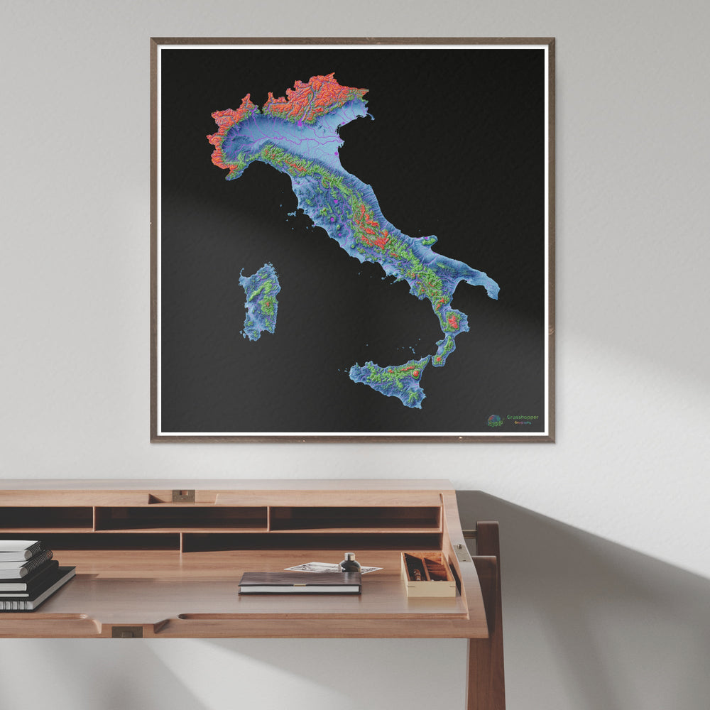 Mapa de elevação da Itália com fundo preto Fine Art Print. Mapa de elevação de alta resolução em um esquema de cores exclusivo, baseado em modelos de elevação digitais gerados a partir de dados de satélite.
