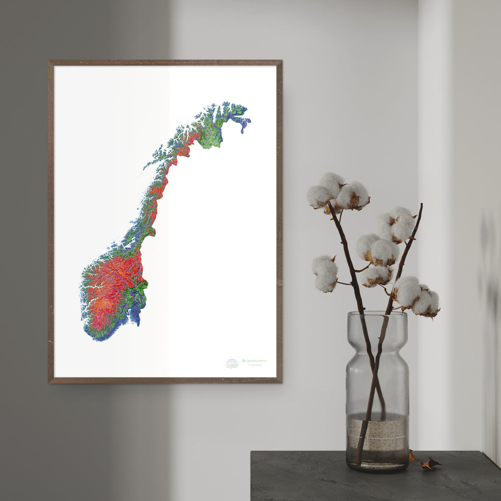 Mapa de elevação da Noruega com fundo branco Fine Art Print. Mapa de elevação de alta resolução em um esquema de cores exclusivo, baseado em modelos de elevação digitais gerados a partir de dados de satélite.