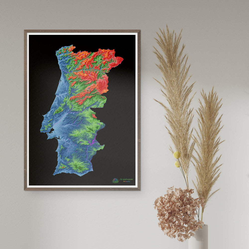 Mapa de elevação de Portugal com fundo preto Fine Art Print. Mapa de elevação de alta resolução em um esquema de cores exclusivo, baseado em modelos digitais de elevação gerados a partir de dados de satélite.