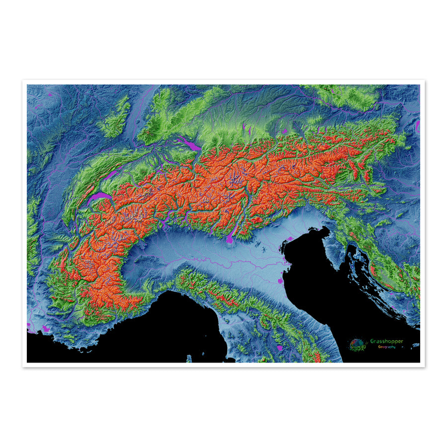 Mapa de elevação dos Alpes com fundo preto Fine Art Print. Mapa de elevação de alta resolução em um esquema de cores exclusivo, baseado em modelos de elevação digitais gerados a partir de dados de satélite.