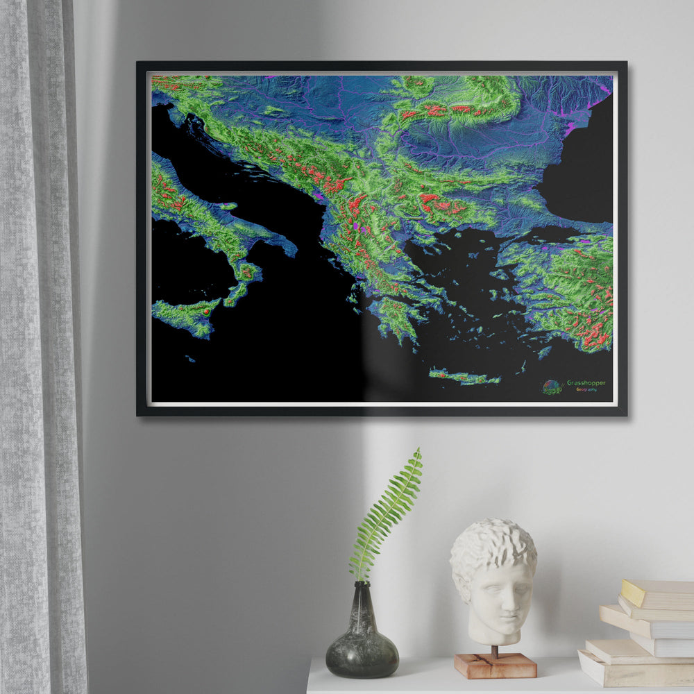 Mapa de elevação dos Bálcãs com fundo preto Fine Art Print. Mapa de elevação de alta resolução em um esquema de cores exclusivo, baseado em modelos de elevação digitais gerados a partir de dados de satélite.