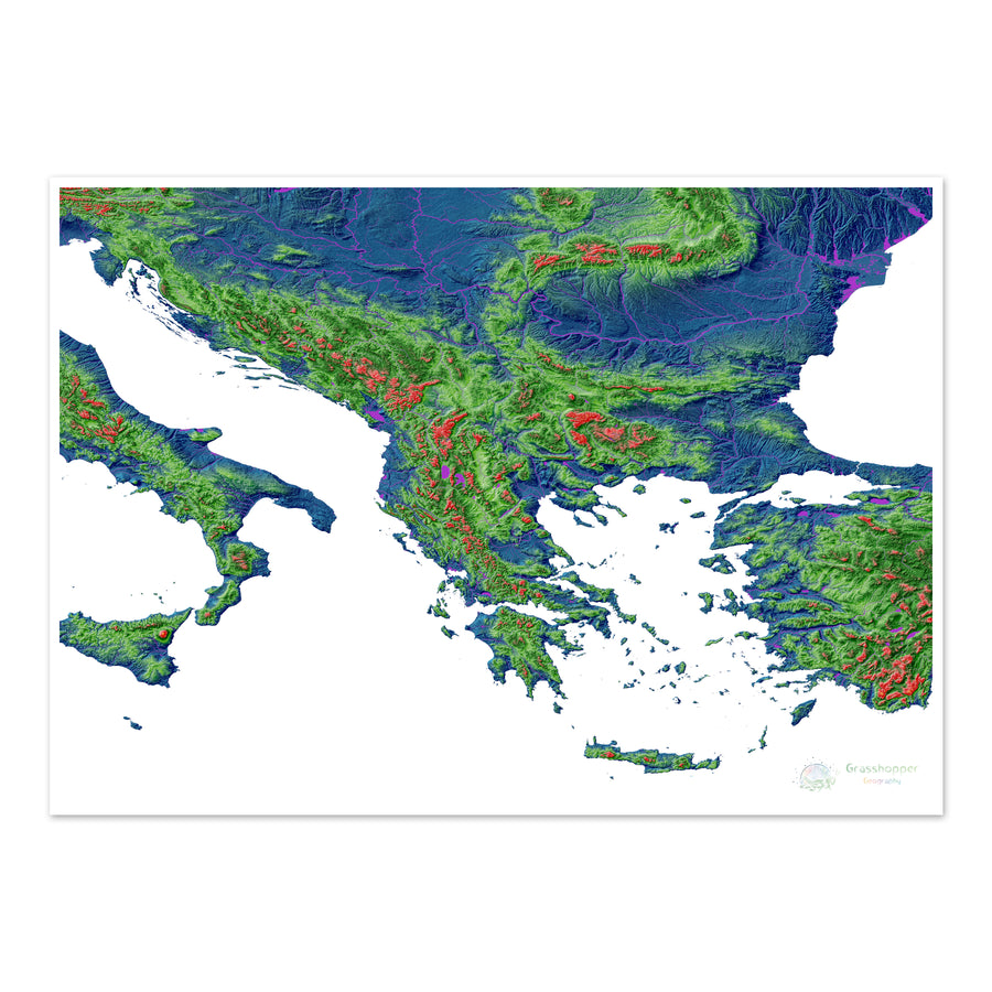Mapa de elevação dos Bálcãs com fundo branco Fine Art Print. Mapa de elevação de alta resolução em um esquema de cores exclusivo, baseado em modelos de elevação digitais gerados a partir de dados de satélite.