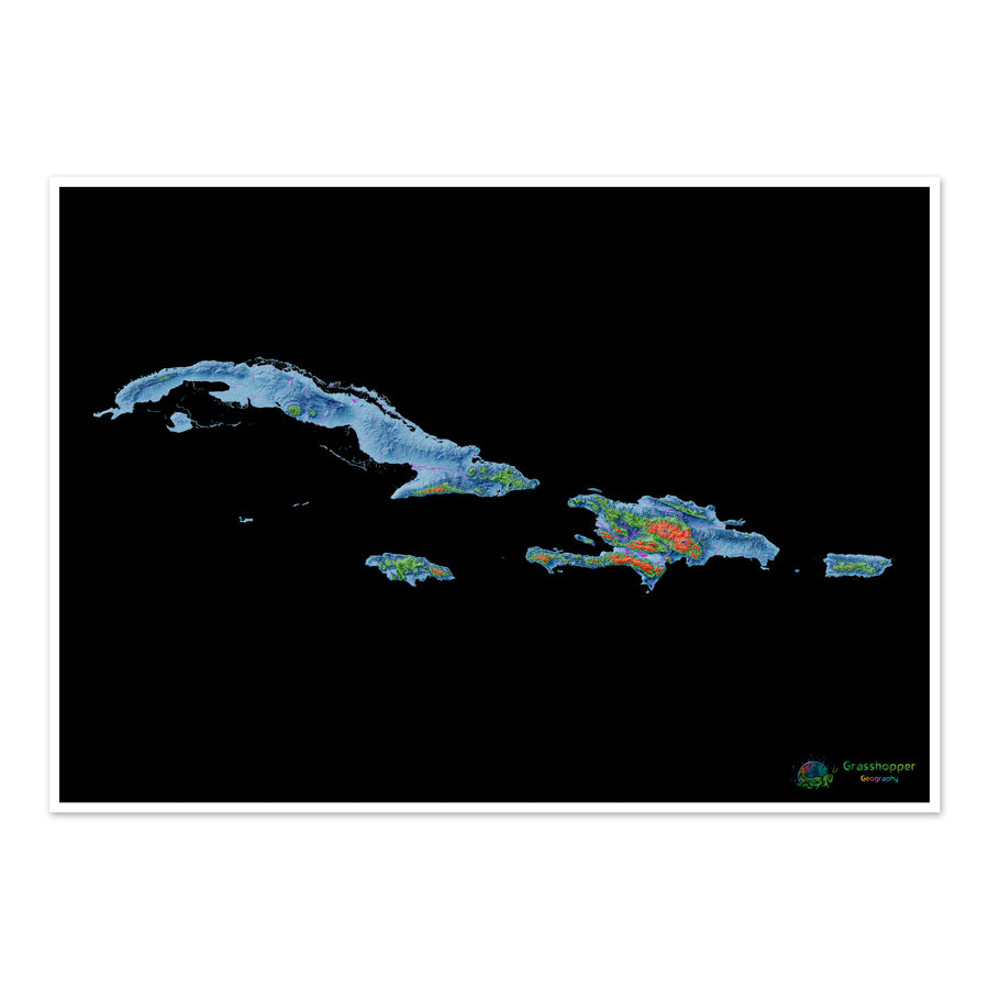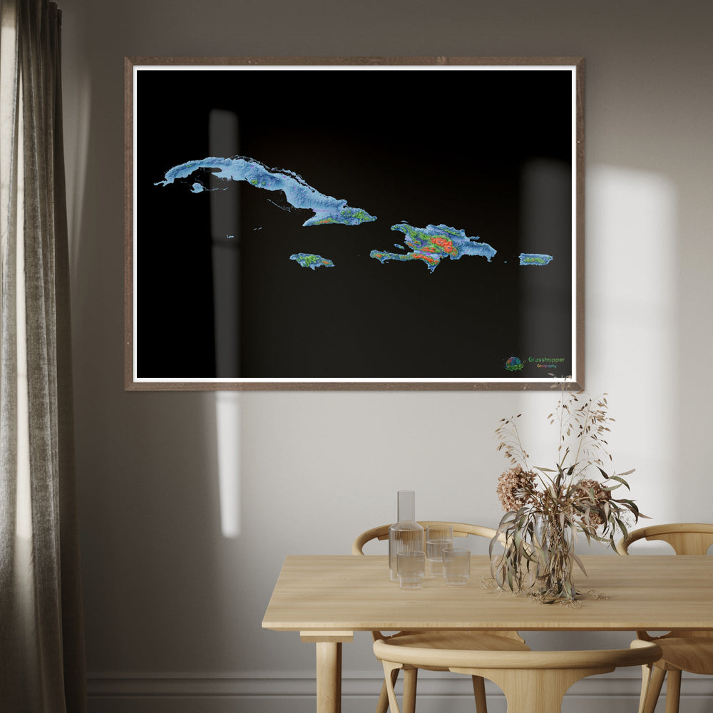 Mapa de elevação das Grandes Antilhas com fundo preto - Fine Art Print. Mapa de elevação de alta resolução em um esquema de cores exclusivo, baseado em modelos de elevação digitais gerados a partir de dados de satélite.