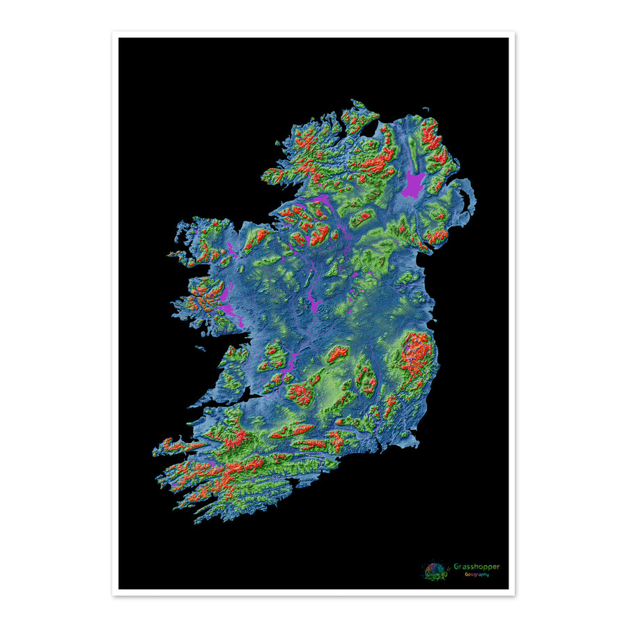 Mapa de elevação da ilha da Irlanda com fundo preto Fine Art Print. Mapa de elevação de alta resolução em um esquema de cores exclusivo, baseado em modelos de elevação digitais gerados a partir de dados de satélite.