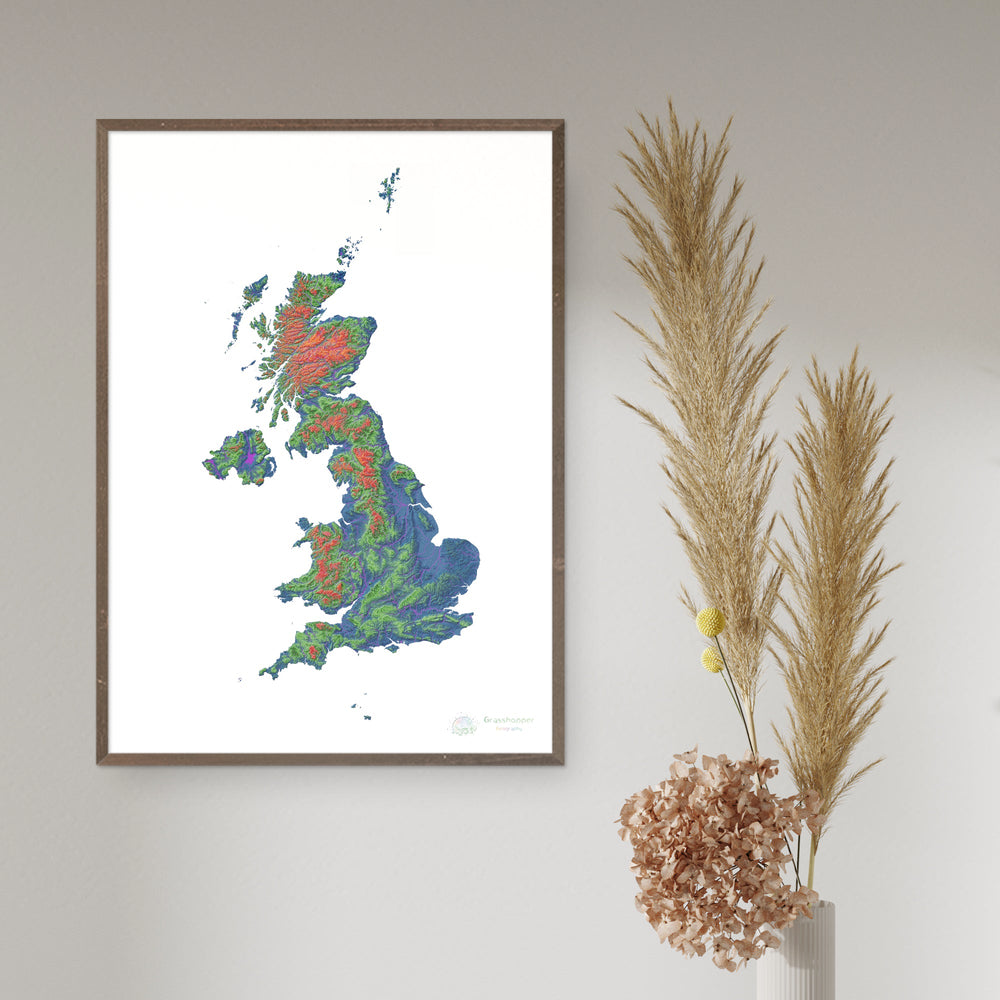 Mapa de elevação do Reino Unido com fundo branco Fine Art Print. Mapa de elevação de alta resolução em um esquema de cores exclusivo, baseado em modelos de elevação digitais gerados a partir de dados de satélite.