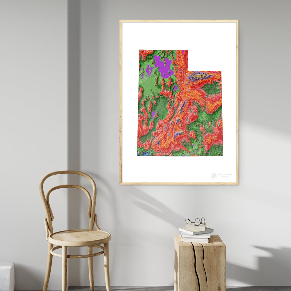 Mapa de elevação de Utah com impressão Fine Art de fundo branco. Mapa de elevação de alta resolução em um esquema de cores exclusivo, baseado em modelos de elevação digitais gerados a partir de dados de satélite.