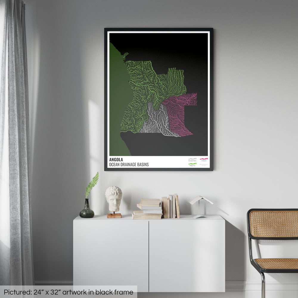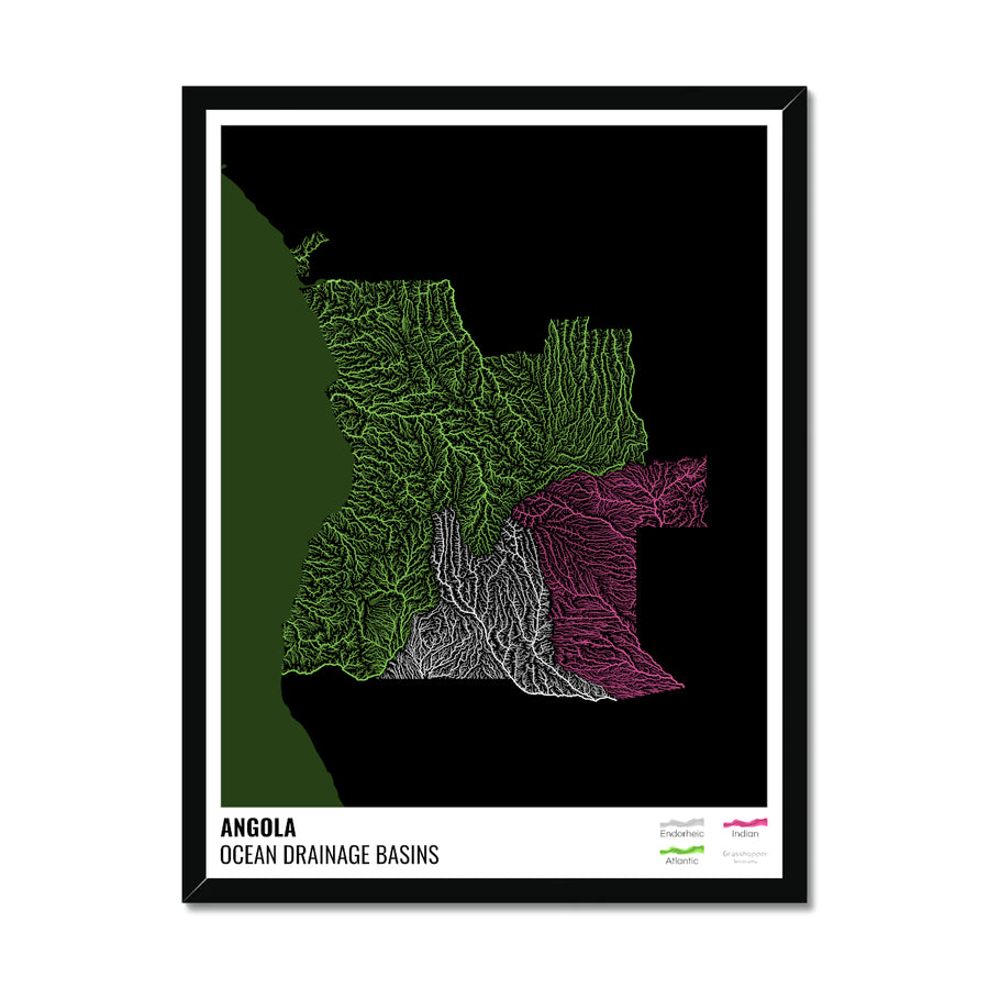 Ангола - Карта океанического водосборного бассейна, черная с легендой v2 - Рамочная печать. Первая в мире научно точная карта высокого разрешения, которая показывает все постоянные и временные потоки и реки, окрашенные в соответствии с океаном, в который они впадают. С помощью этих карт мы получаем более глубокое понимание сложных гидрологических систем, которые поддерживают жизнь на нашей планете. Демонстрируя эту печать у себя дома или в офисе, вы привносите частичку природы в свое пространство. Но эта карта - больше, чем просто данные, преобразованные в искусство: она также пробуждает любопытство и служит отличным началом разговора, приглашая зрителей поднять вопросы о нашей природной среде через увлекательный мир рек.
