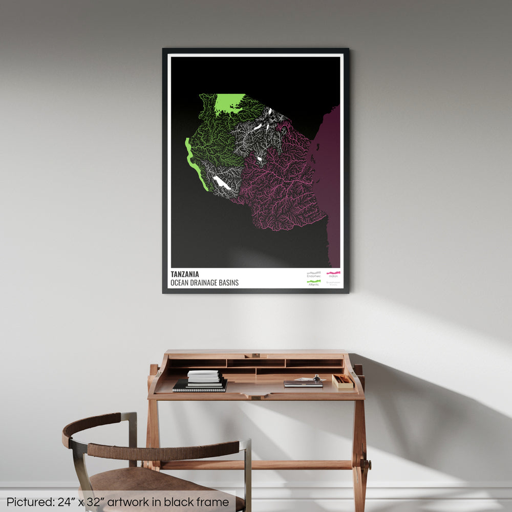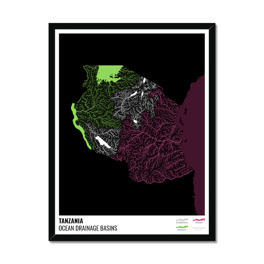 Танзания - Карта океанического водосборного бассейна, черная с легендой v2 - Рамочная печать. Первая в мире научно точная карта высокого разрешения, которая показывает все постоянные и временные ручьи и реки, окрашенные в соответствии с океаном, в который они впадают. С помощью этих карт мы получаем более глубокое понимание сложных гидрологических систем, которые поддерживают жизнь на нашей планете. Демонстрируя эту печать у себя дома или в офисе, вы привносите частичку природы в свое пространство. Но эта карта - больше, чем просто данные, преобразованные в искусство: она также пробуждает любопытство и служит отличным началом разговора, приглашая зрителей поднять вопросы о нашей природной среде через увлекательный мир рек.