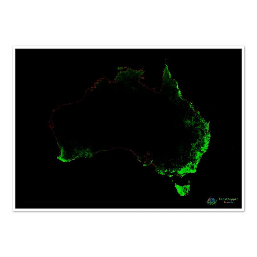 Карта лесного покрова Австралии Fine Art Print. Карта лесного покрова высокого разрешения, основанная на анализе спутниковых данных, со специальными датчиками, предназначенными для обнаружения и распознавания отражения от растительности.