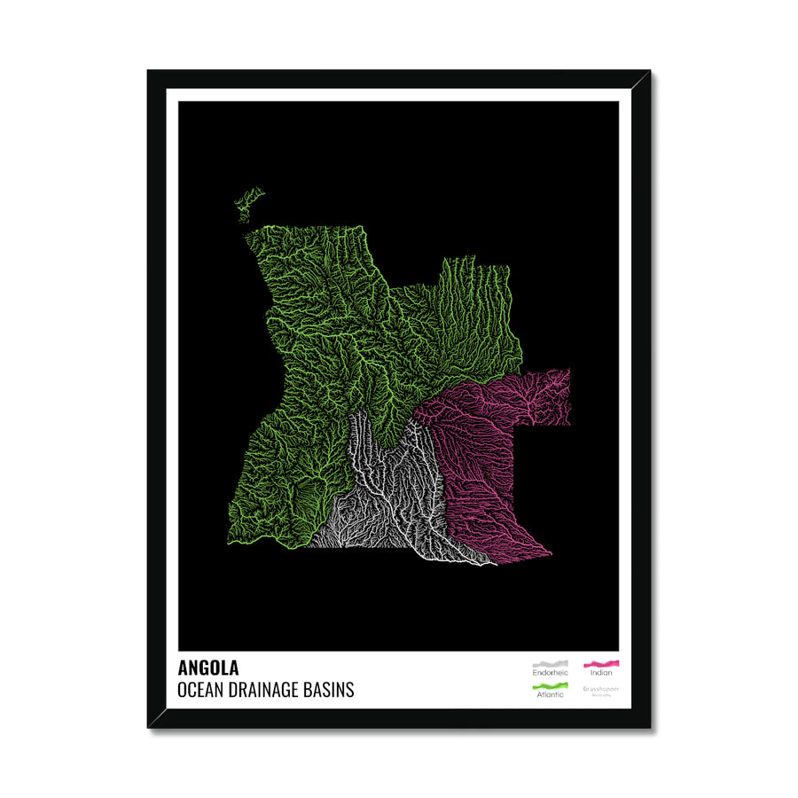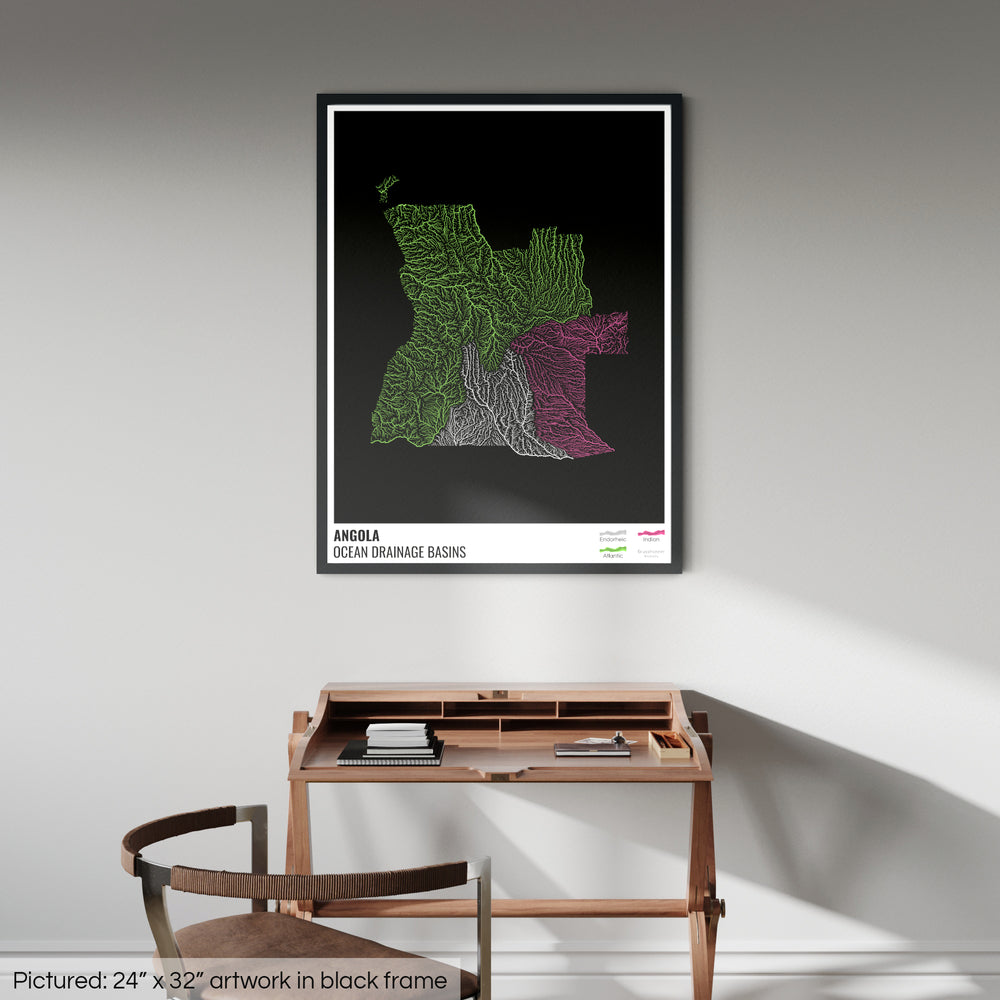 Ангола - Карта океанического водосборного бассейна, черная с легендой v1 - Рамочная печать. Первая в мире научно точная карта высокого разрешения, которая показывает все постоянные и временные ручьи и реки, окрашенные в соответствии с океаном, в который они впадают. С помощью этих карт мы получаем более глубокое понимание сложных гидрологических систем, которые поддерживают жизнь на нашей планете. Демонстрируя эту печать у себя дома или в офисе, вы привносите частичку природы в свое пространство. Но эта карта - больше, чем просто данные, преобразованные в искусство: она также пробуждает любопытство и служит отличным началом разговора, приглашая зрителей поднять вопросы о нашей природной среде через увлекательный мир рек.