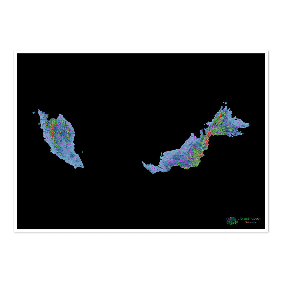 Карта высот Малайзии с черным фоном Fine Art Print. Карта высот высокого разрешения в уникальной цветовой схеме, основанная на цифровых моделях высот, созданных на основе спутниковых данных.