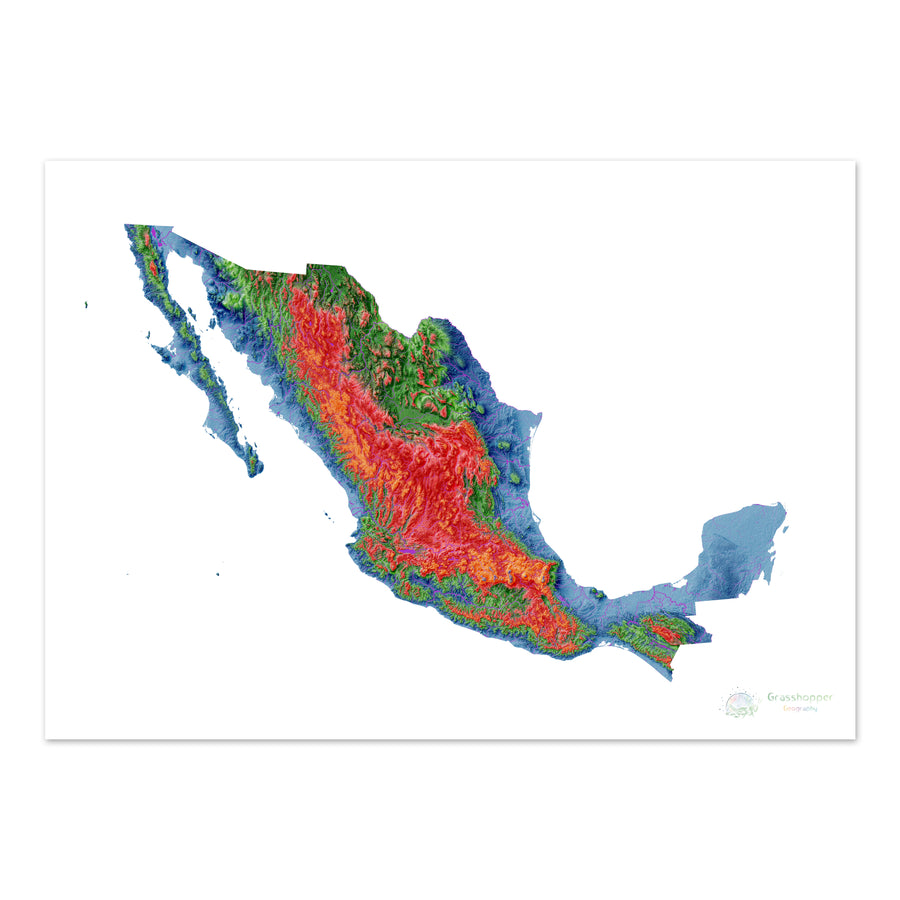 Карта рельефа Мексики с белым фоном Fine Art Print. Карта рельефа высокого разрешения в уникальной цветовой схеме, основанная на цифровых моделях рельефа, созданных на основе спутниковых данных.