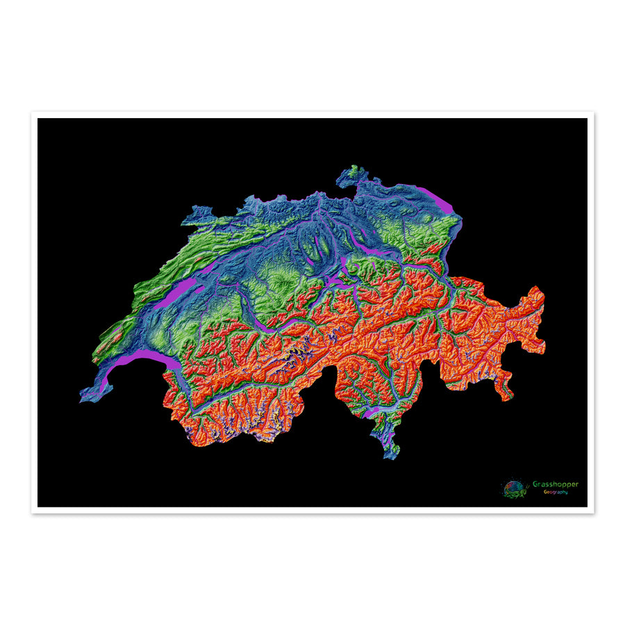 Карта рельефа Швейцарии с черным фоном Fine Art Print. Карта рельефа высокого разрешения в уникальной цветовой схеме, основанная на цифровых моделях рельефа, созданных на основе спутниковых данных.
