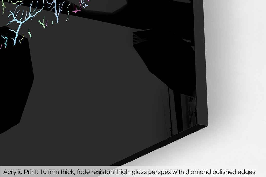 The fine art Giclée print is hand mounted onto a 10mm thick, premium polished, high-gloss acrylic glass that results in a vibrant finish. The transparency of the acrylic enhances the colours and details of the artwork, creating a stunning visual effect that will make a bold statement in any space.