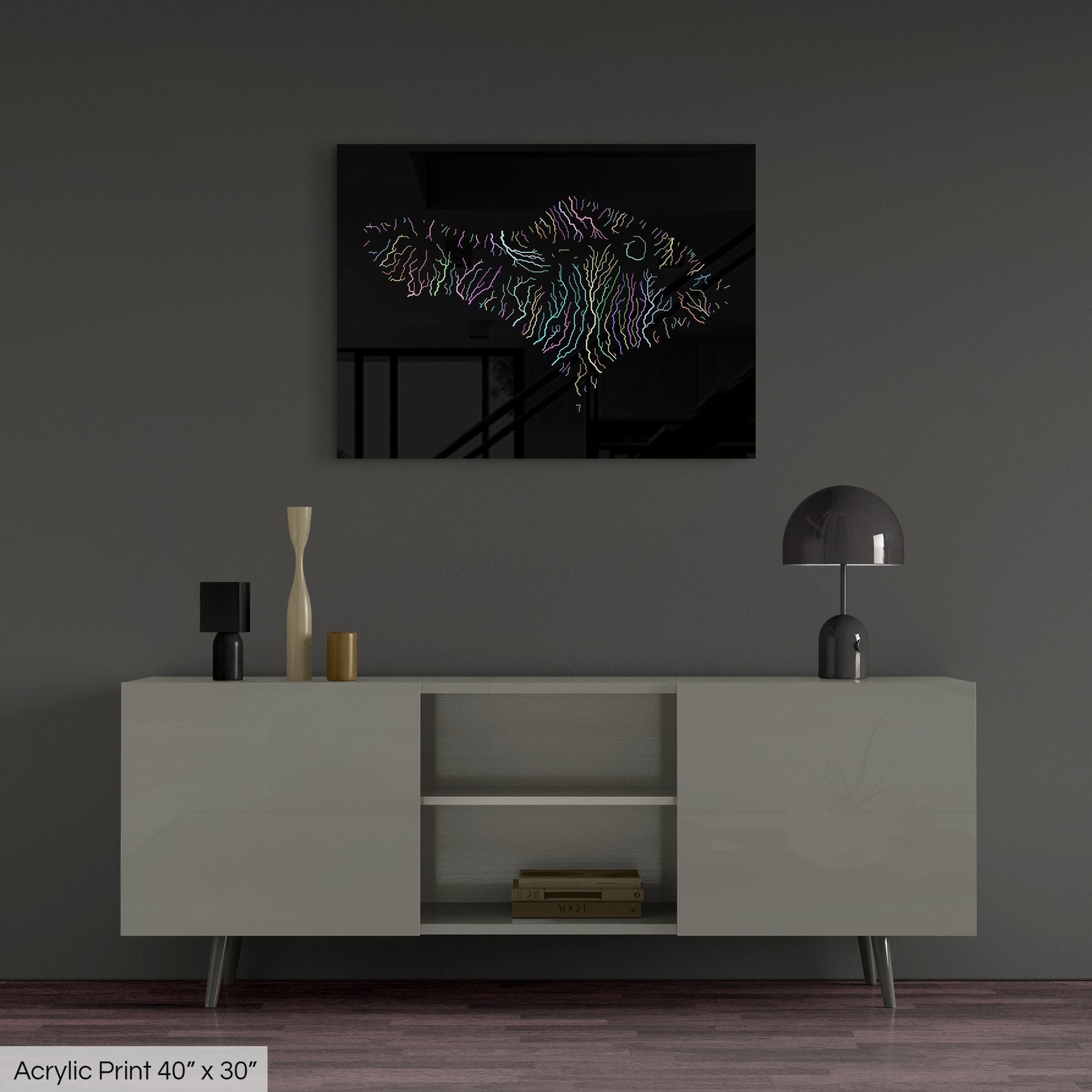 The fine art Giclée print is hand mounted onto a 10mm thick, premium polished, high-gloss acrylic glass that results in a vibrant finish. The transparency of the acrylic enhances the colours and details of the artwork, creating a stunning visual effect that will make a bold statement in any space.