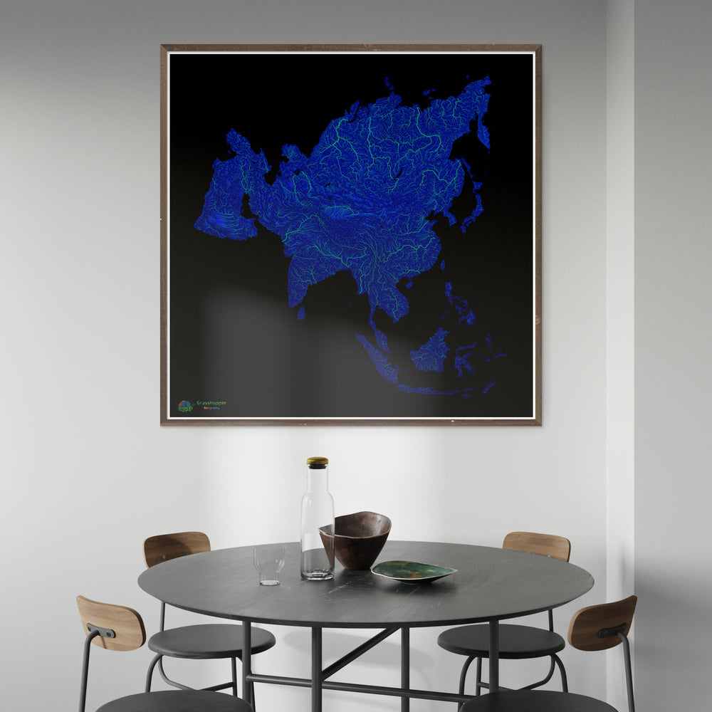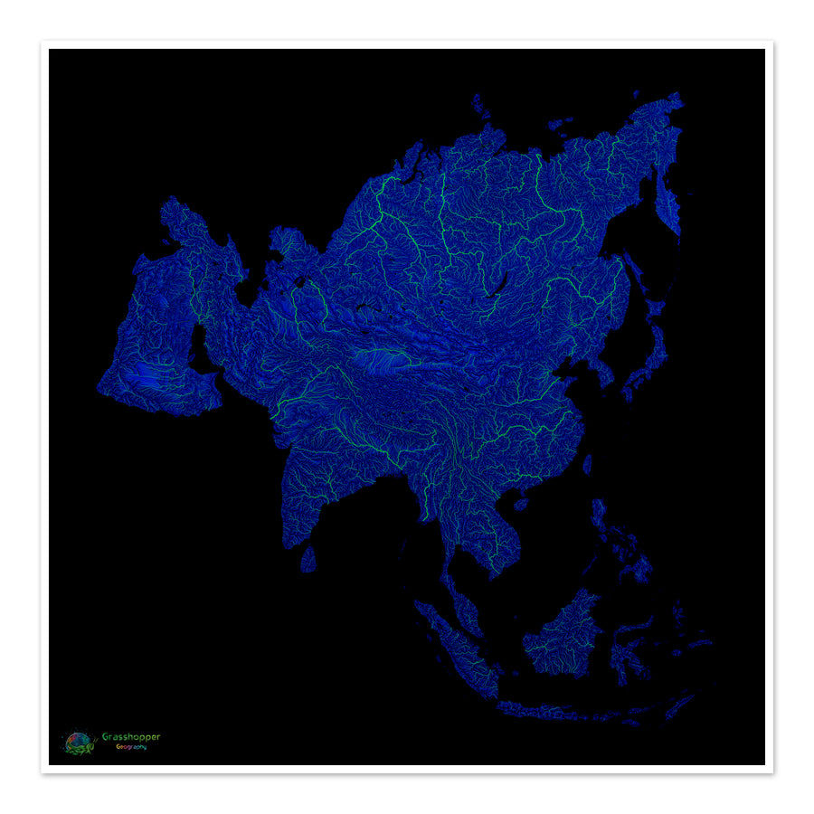 Азия - Карта рек синего и зеленого цвета на черном фоне - Художественная печать