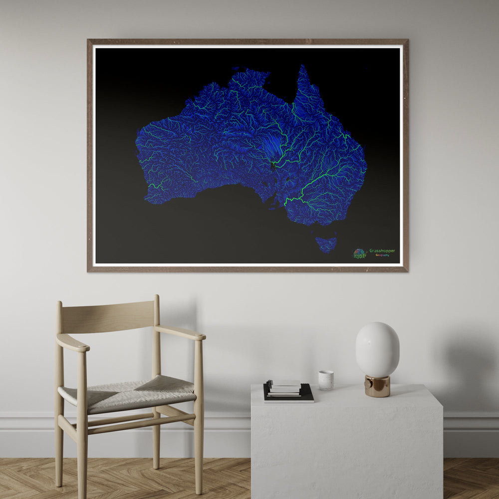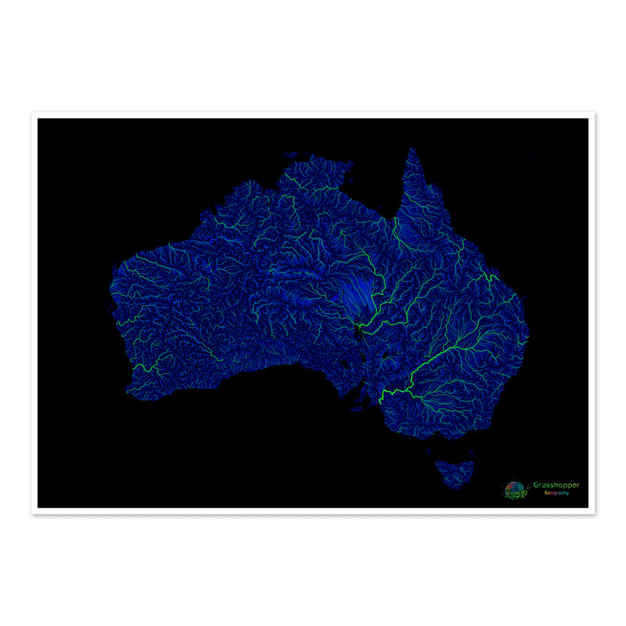 Австралия - Карта рек синего и зеленого цвета на черном фоне - Художественная печать