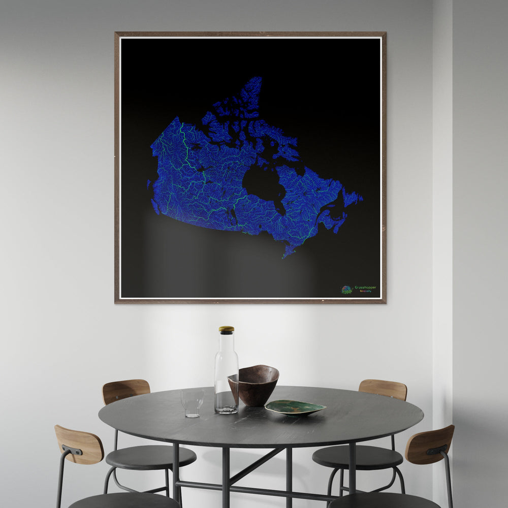 Канада - Карта рек синего и зеленого цвета на черном фоне - Художественная печать