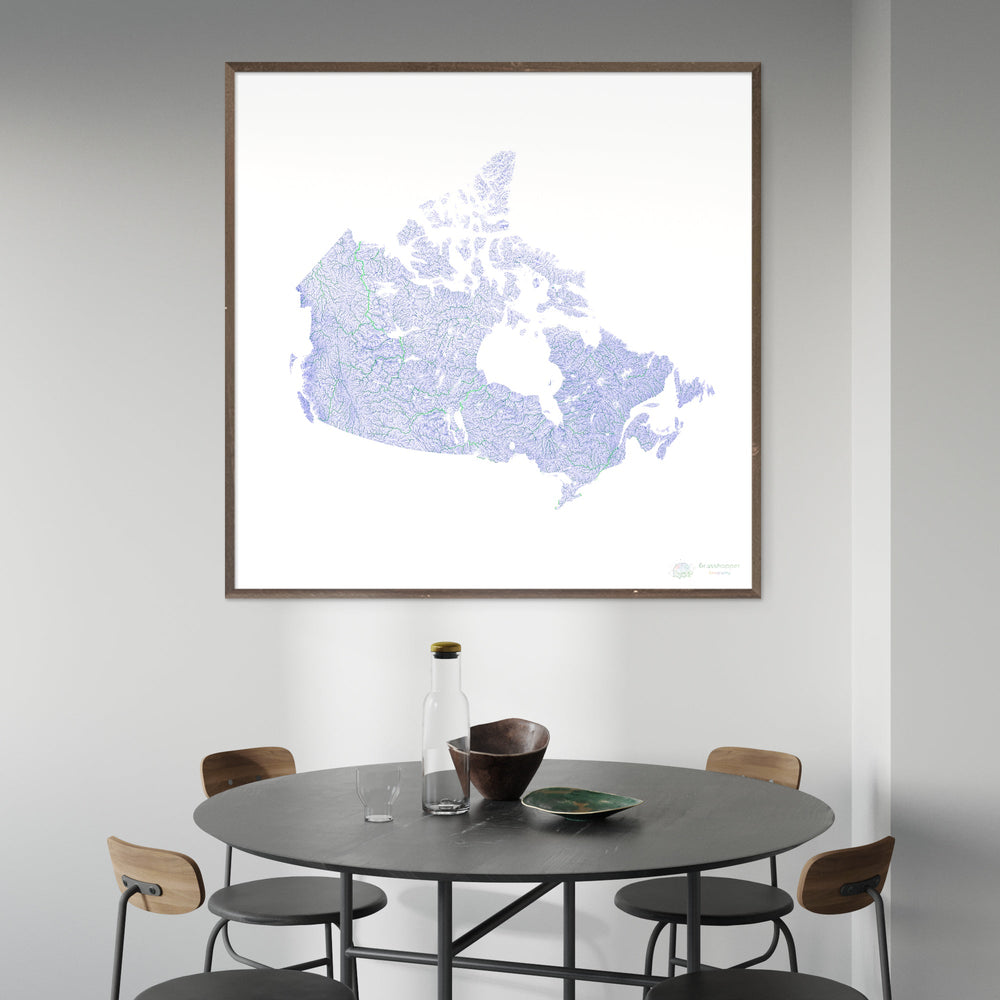 Канада - Карта рек синего и зеленого цвета на белом фоне - Художественная печать