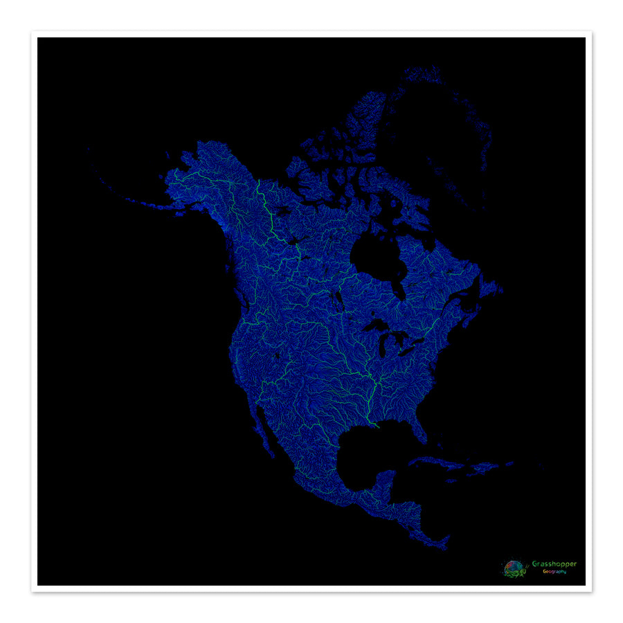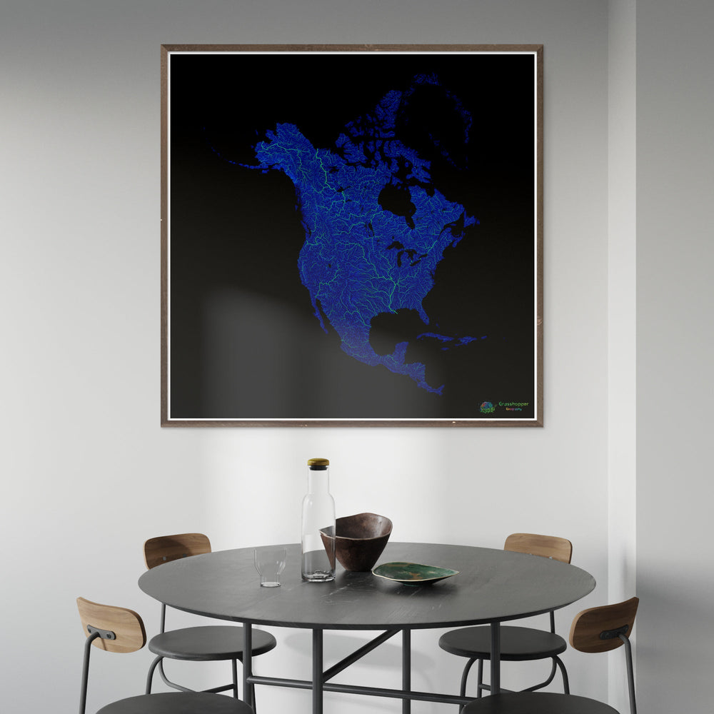 Северная Америка - Карта рек синего и зеленого цвета на черном фоне - Художественная печать