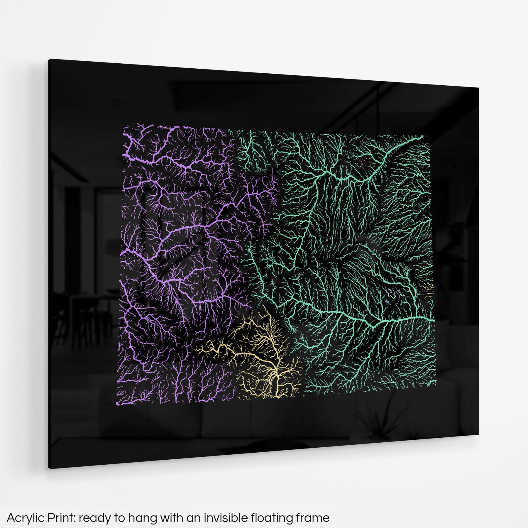 A fine art Giclée print is hand mounted onto 10mm thick high-gloss acrylic perspex that will protect your map from harmful UV light, keeping colours fresh and vivid for years to come. Ready to hang with an invisible floating frame.