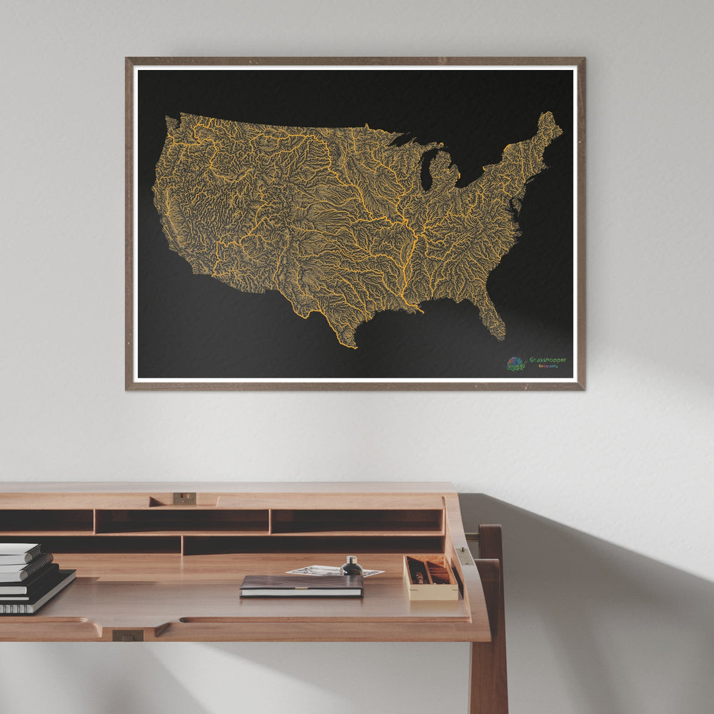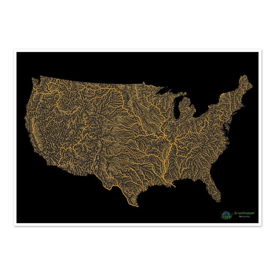 Соединенные Штаты - Серо-оранжевая карта рек на черном фоне - Художественная печать