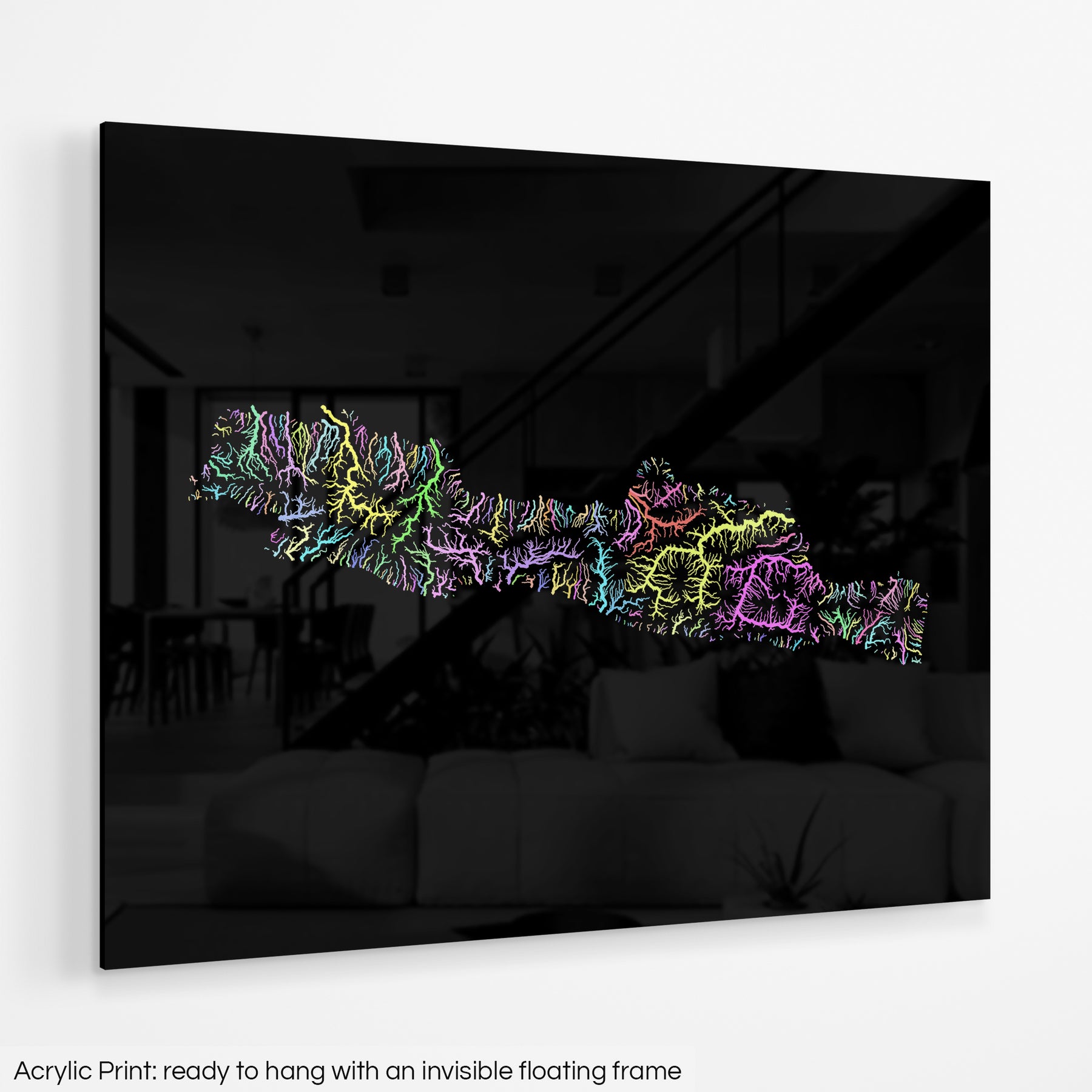 A fine art Giclée print is hand mounted onto 10mm thick high-gloss acrylic perspex that will protect your map from harmful UV light, keeping colours fresh and vivid for years to come. Ready to hang with an invisible floating frame.