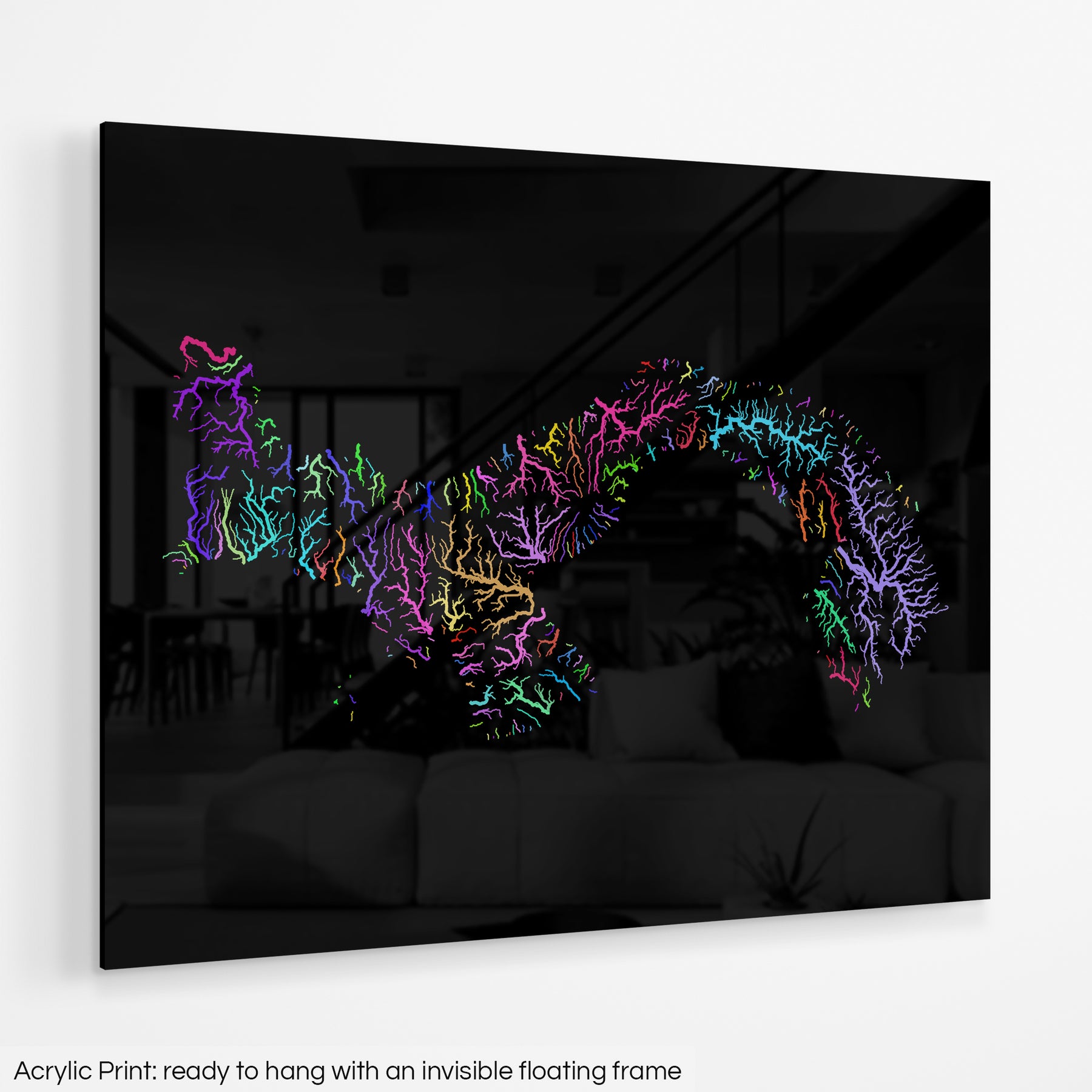 This high-resolution river basin map shows each catchment area in a different colour. Its vibrant colour scheme makes this map a lively addition to any space.