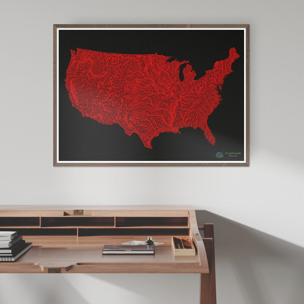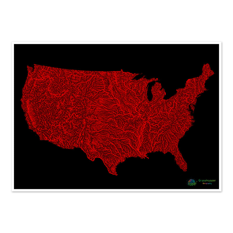 Карта Красной реки смежных Соединенных Штатов с черным фоном - Fine Art Print. Карта речного бассейна высокого разрешения, показывающая все постоянные и временные водотоки ярко-красным цветом.