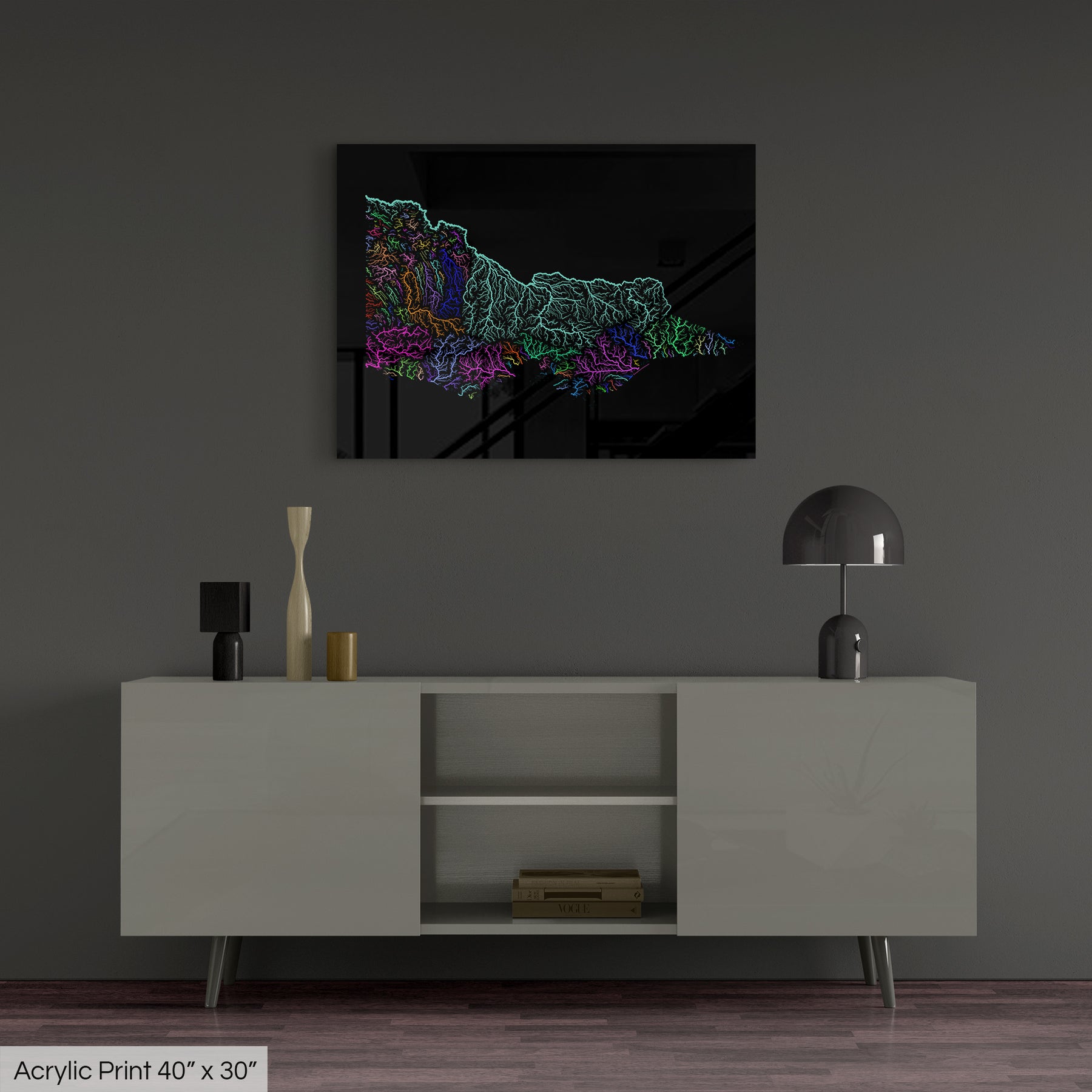 This high-resolution river basin map shows each catchment area in a different colour. Its vibrant colour scheme makes this map a lively addition to any space.